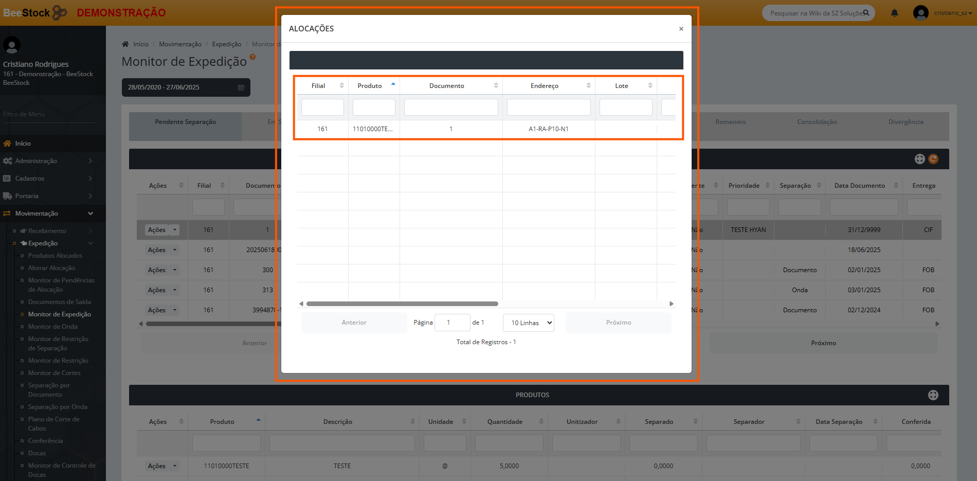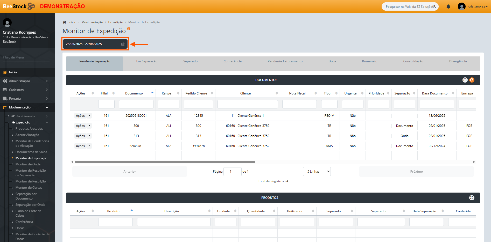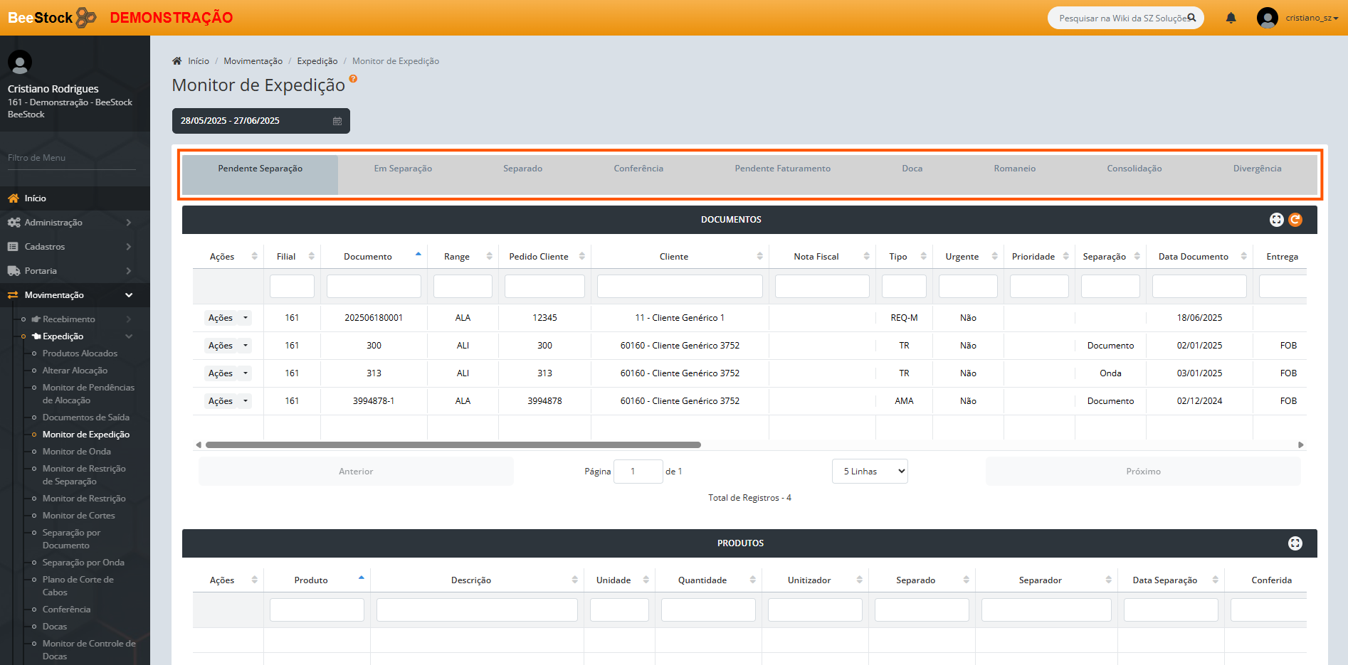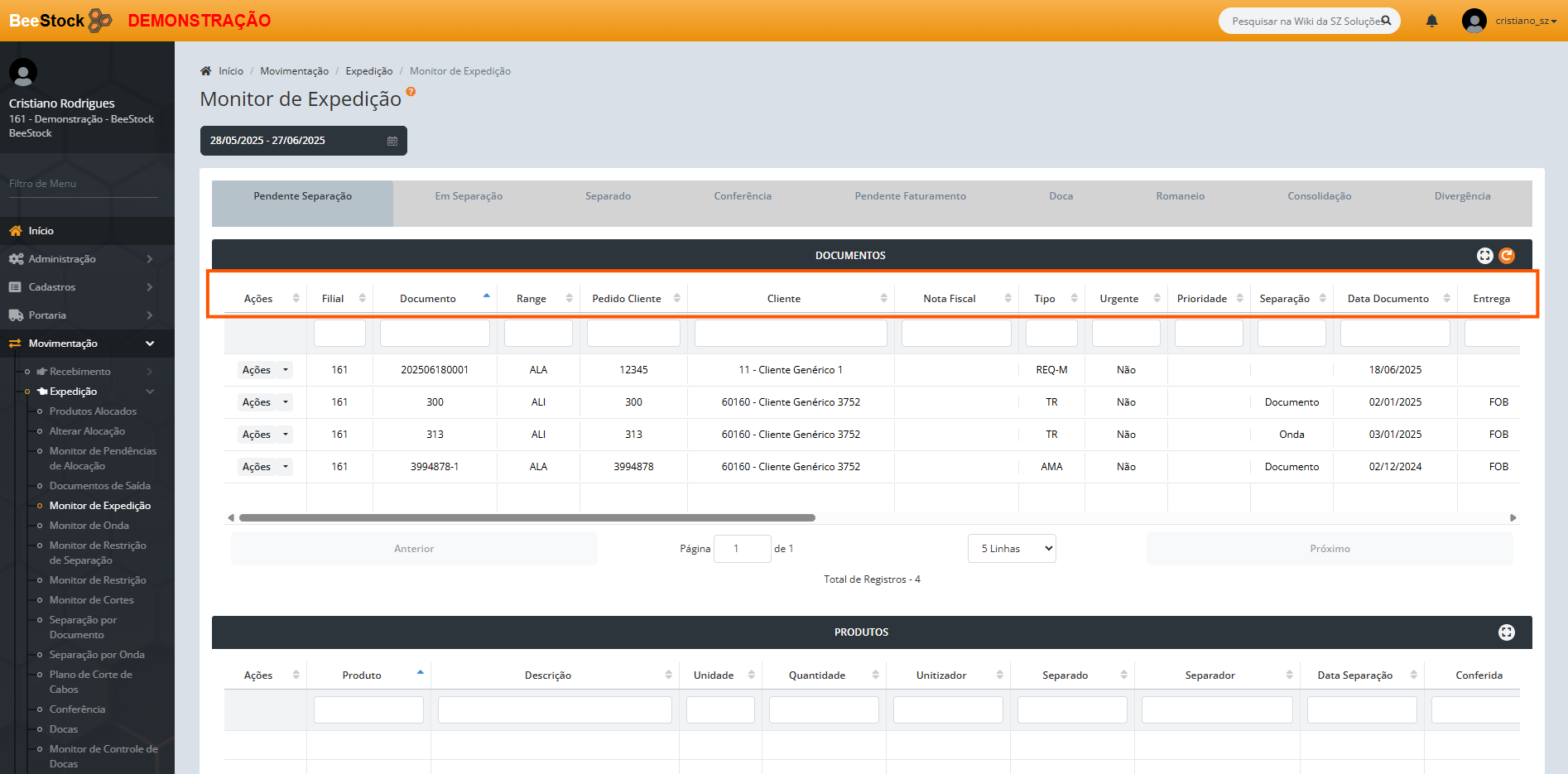 A partir da seleção de um documento, na parte inferior da tela em Produtos, o usuário possui a visualização dos produtos vinculados ao documento acima para o range em questão, com as informações relacionadas de acordo com a etapa do processo de expedição que o documento se encontra.