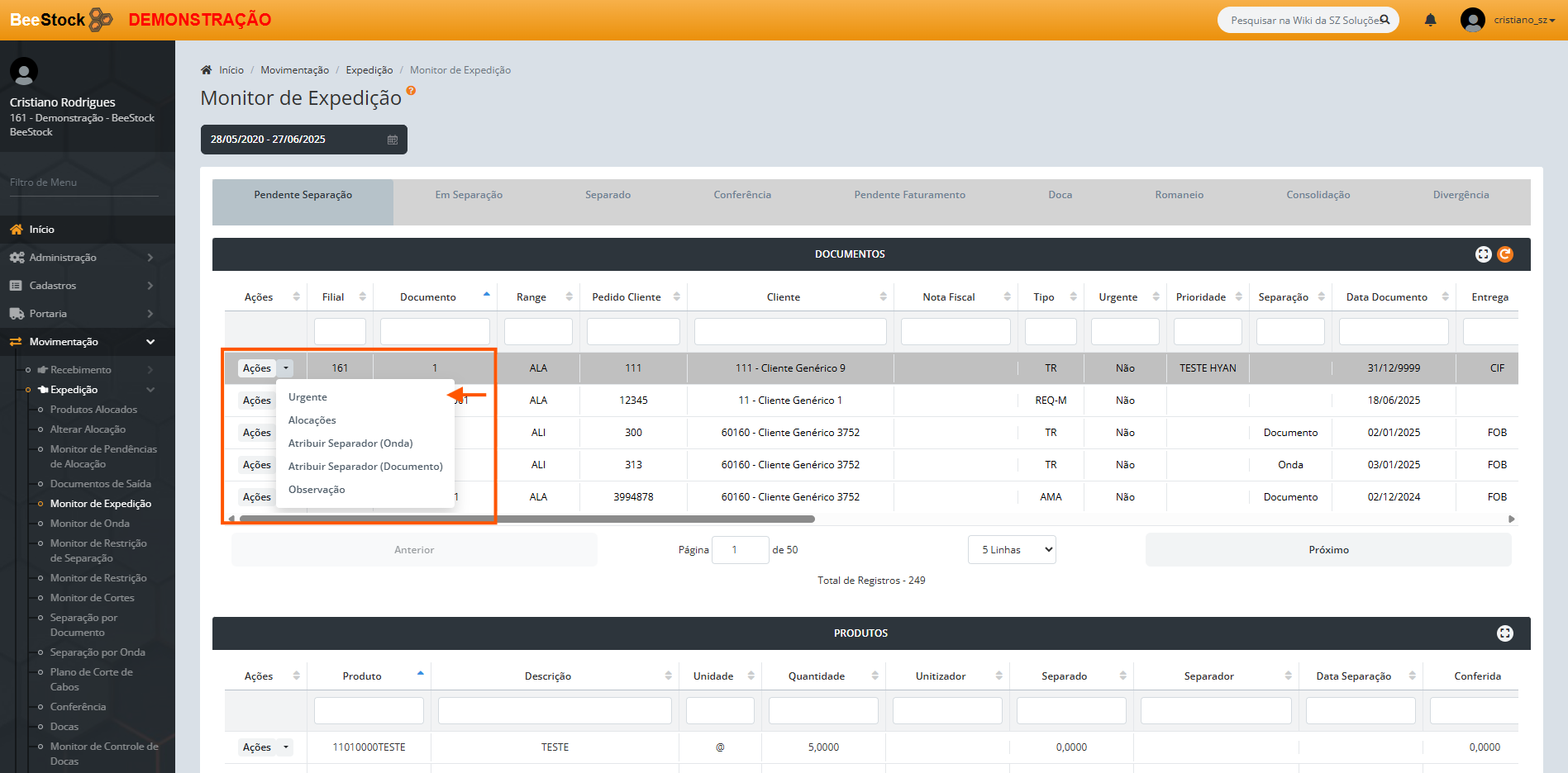 Ainda no grid Documentos, na aba Pendente Separação, ao clicar em Ações, o usuário dispõe das funções: