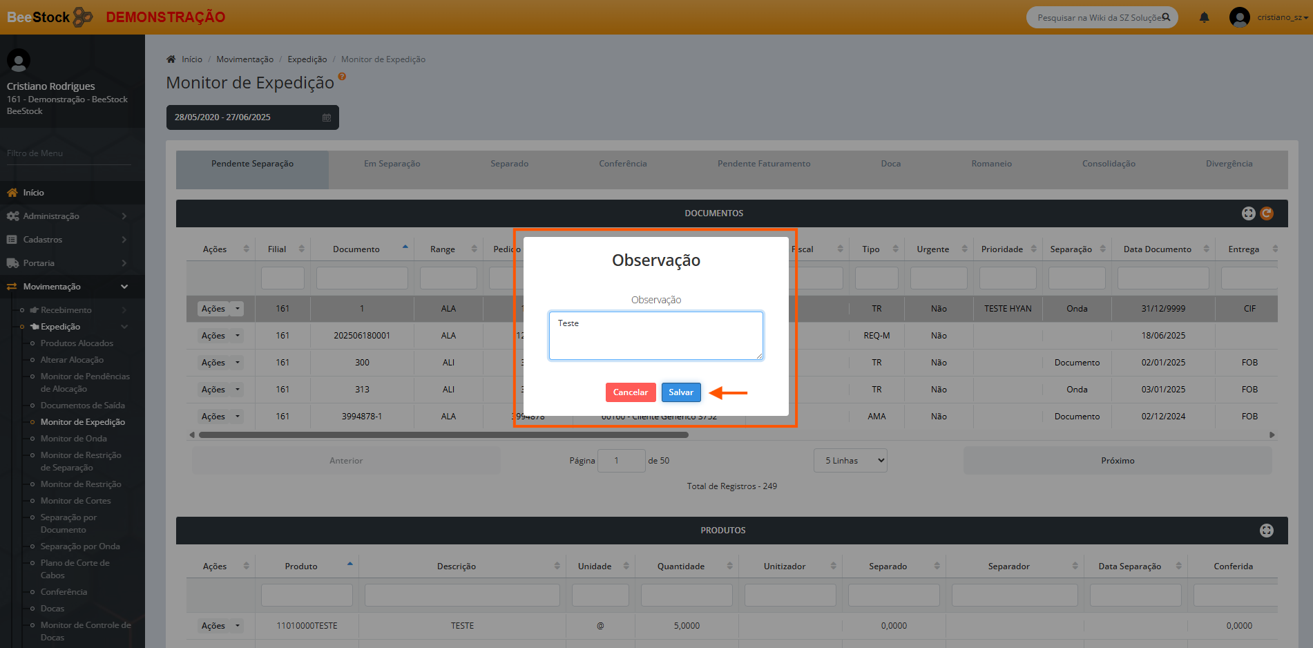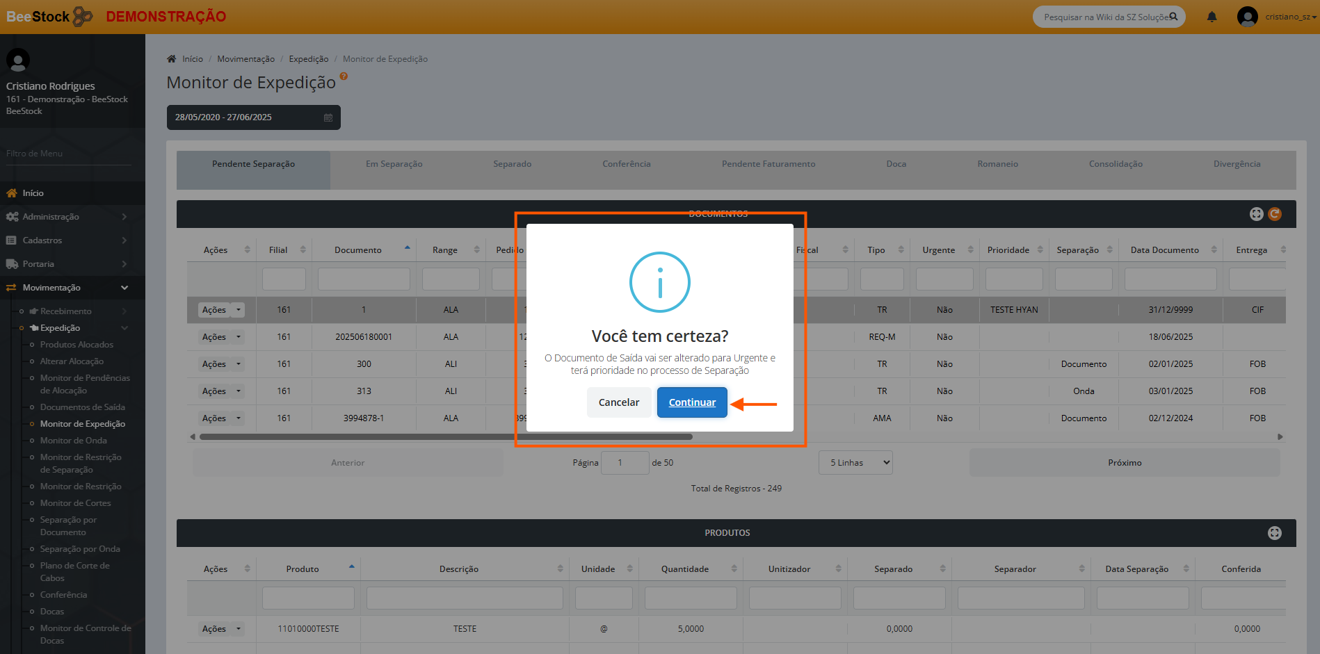 - Urgente – Ao selecionar o documento como urgente, ele é priorizado no processo de separação, de modo que, ao buscar os documentos para iniciar o processo de expedição, o usuário primeiro terá acesso ao documento priorizado.