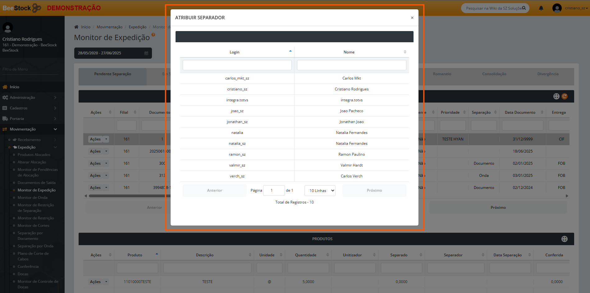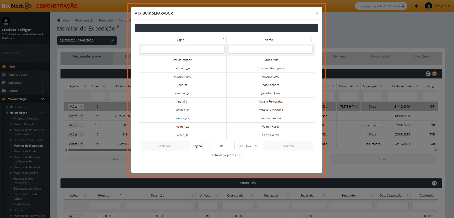 - Separador por Onda – Atribui a sequência (linha de produto) do documento a um determinado usuário, de modo que somente ele terá acesso a essa sequência na separação (na mesma função é possível trocar o separador inicialmente atribuído, caso necessário).