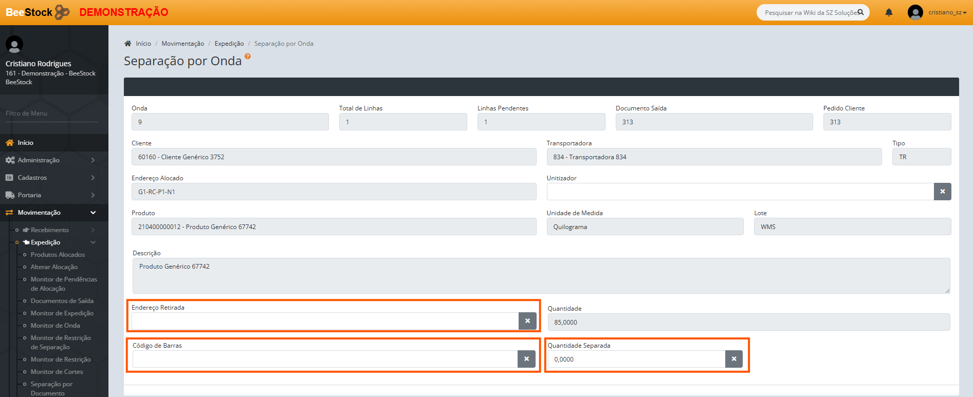 6. Informe o código de barras do produto que está sendo separado fisicamente.