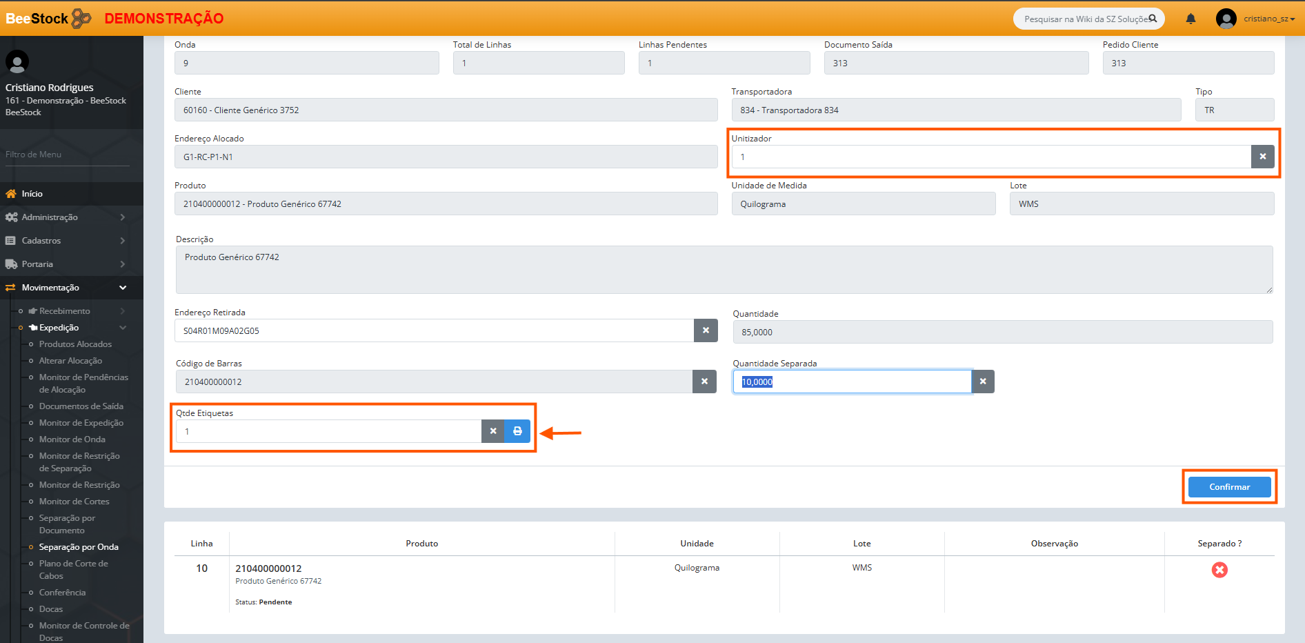 7. Confirme a Quantidade Separada (A quantidade pode ser total ou parcial).