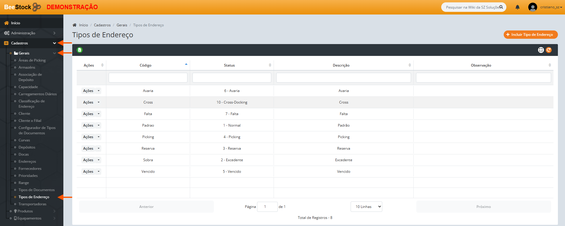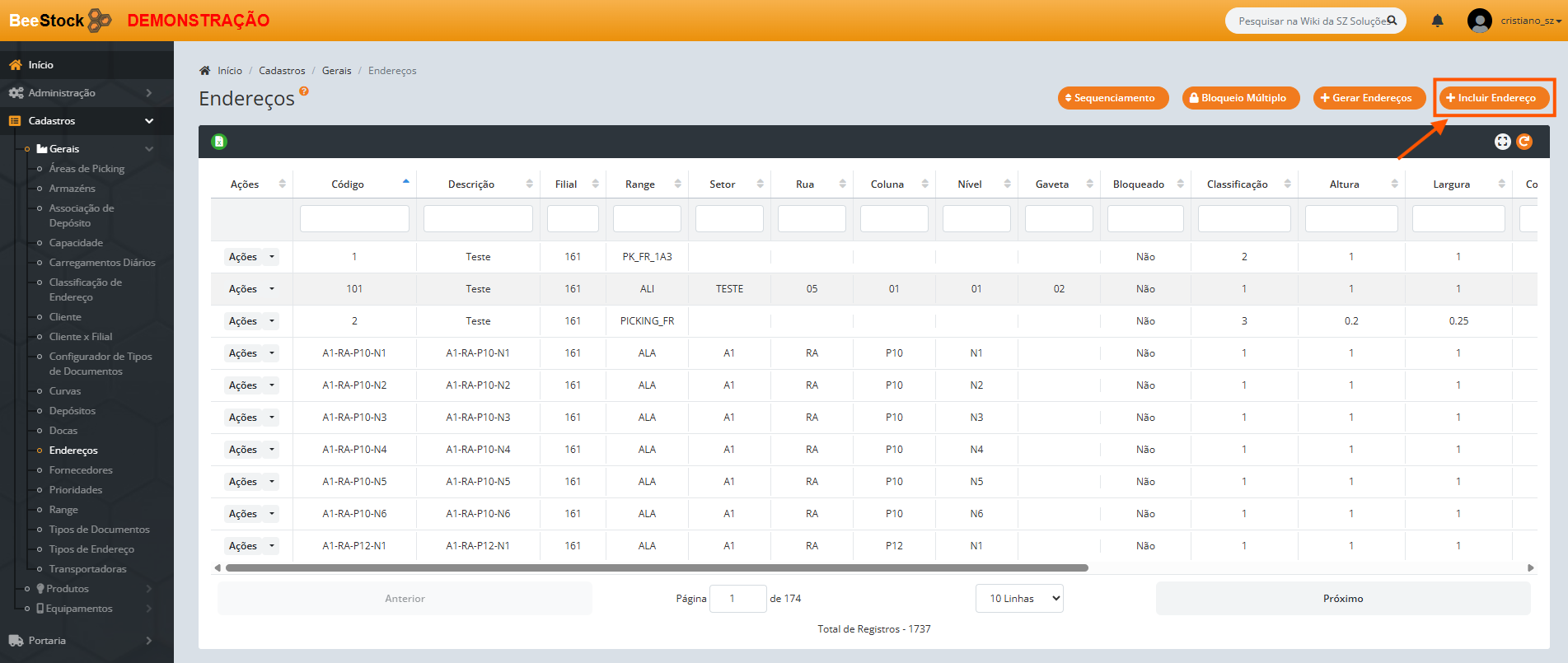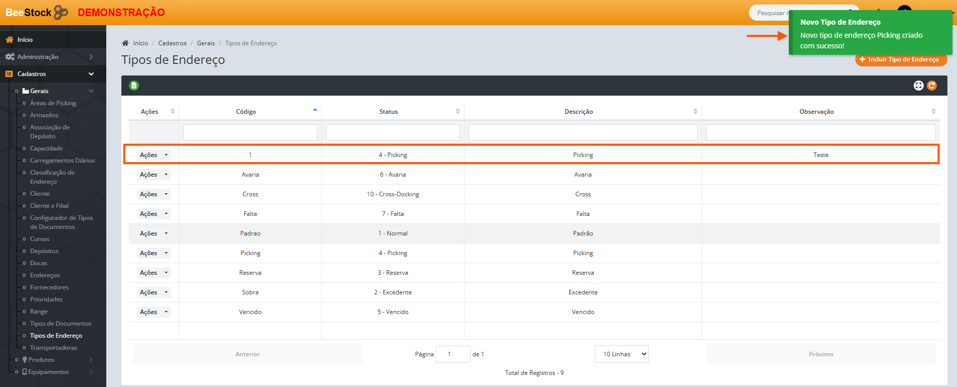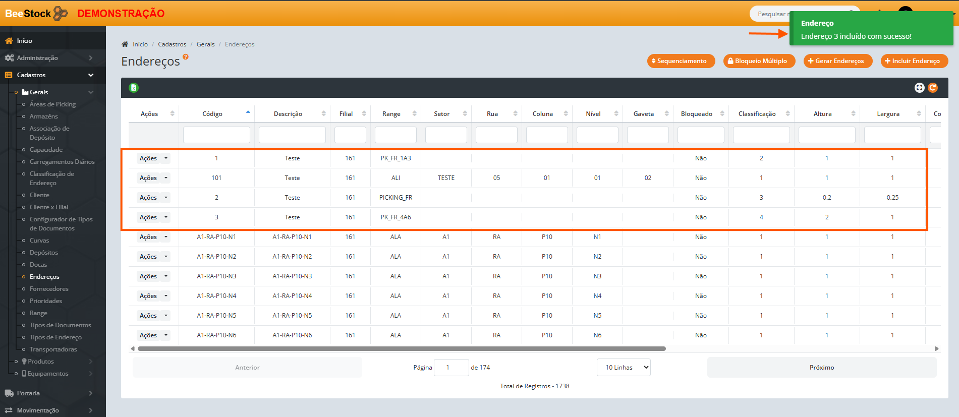 2. Crie os endereços que serão utilizados como Picking.