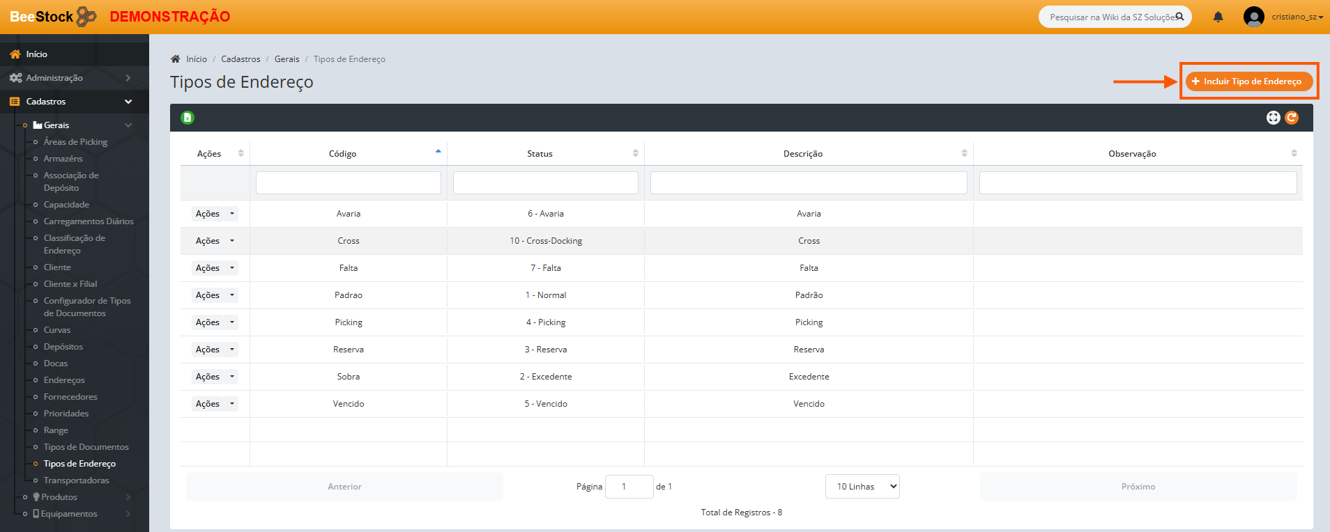 1. Clique no botão + Incluir Nova Área de Picking.