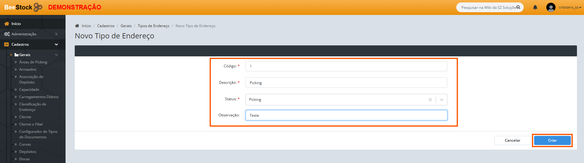 2. No campo Descrição, informe, por exemplo, “Picking”.