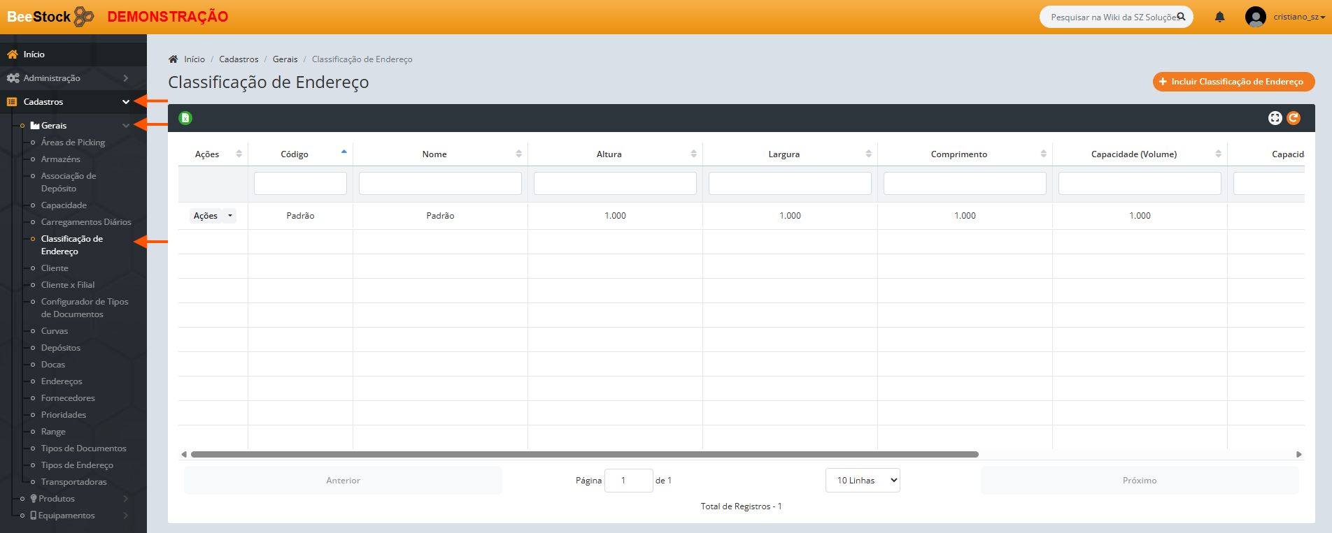 A classificação define o “tamanho” ou “tipo” físico do endereço (ex: um porta-palete, uma prateleira pequena). Isso permite que o sistema saiba quantos produtos cabem em cada tipo de espaço.