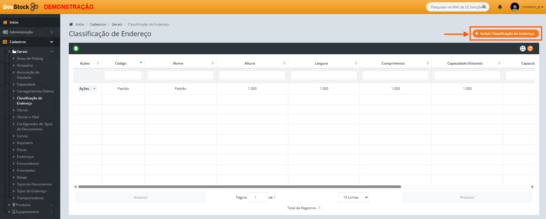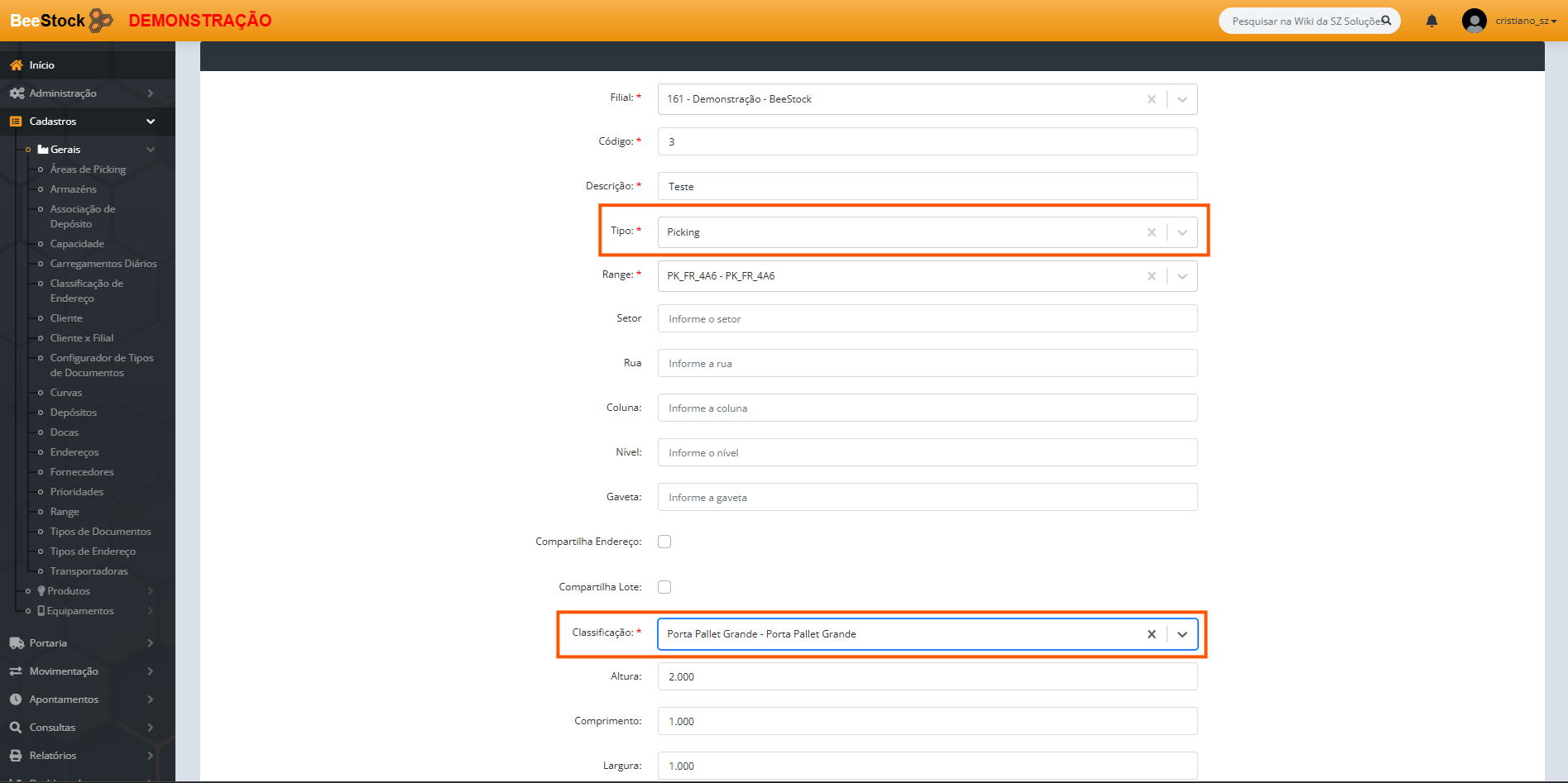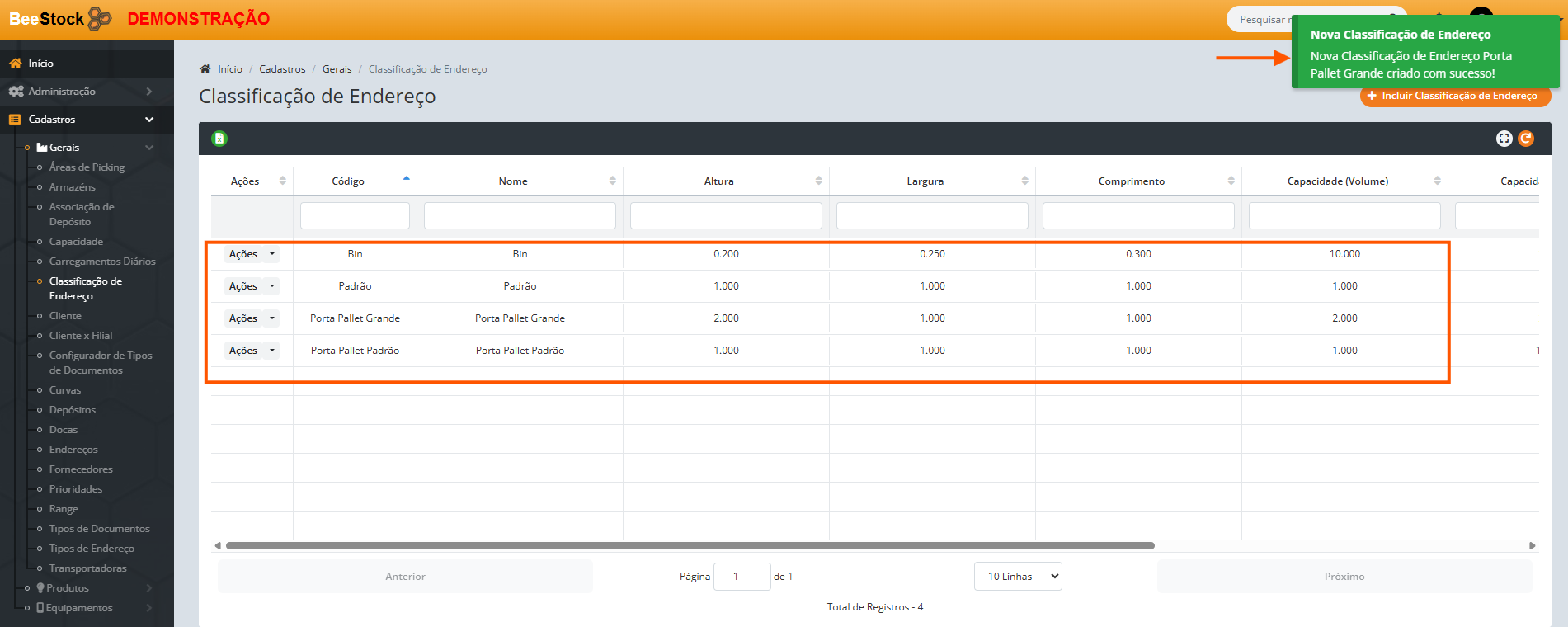 3. Selecione a Classificação de Endereço (ex: Porta Pallet Padrão).