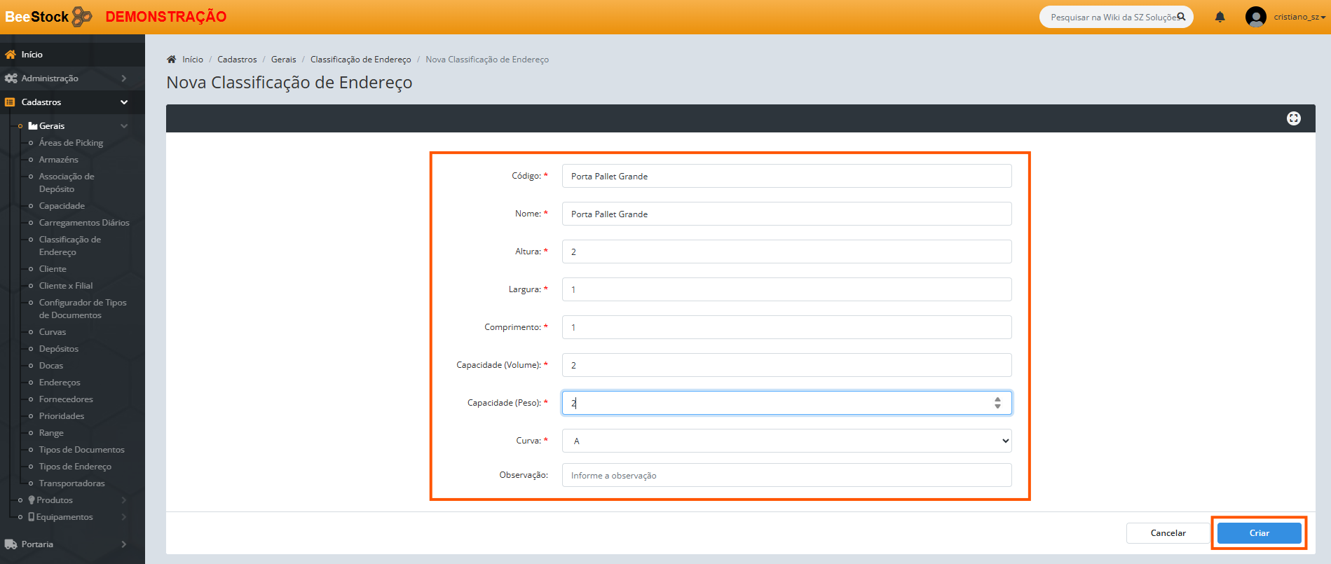 4. No campo Classificação, selecione a classificação correspondente (ex: Porta Pallet Padrão, Bin) depois clique em Criar.