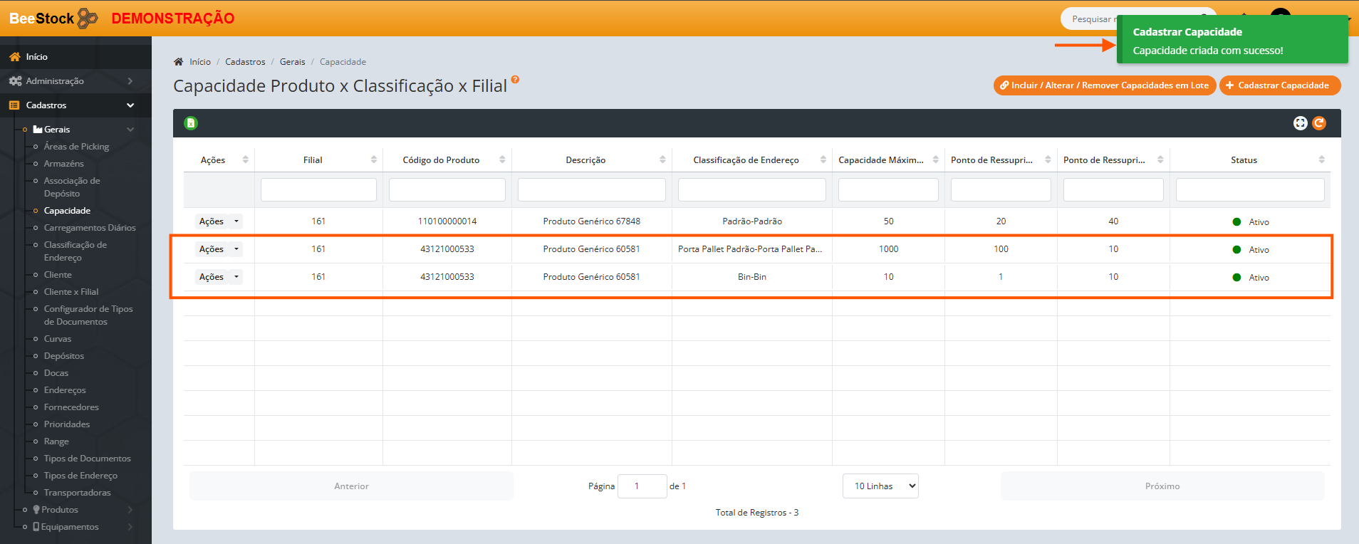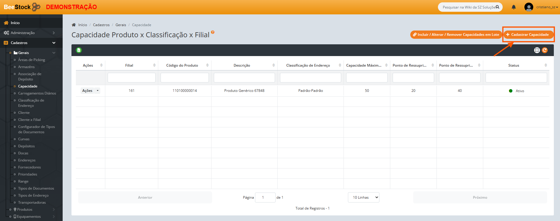 Esta é a configuração central do ressuprimento. Ela define, para cada produto, quantos itens cabem em cada classificação de endereço e qual o ponto mínimo que dispara a necessidade de reabastecimento.