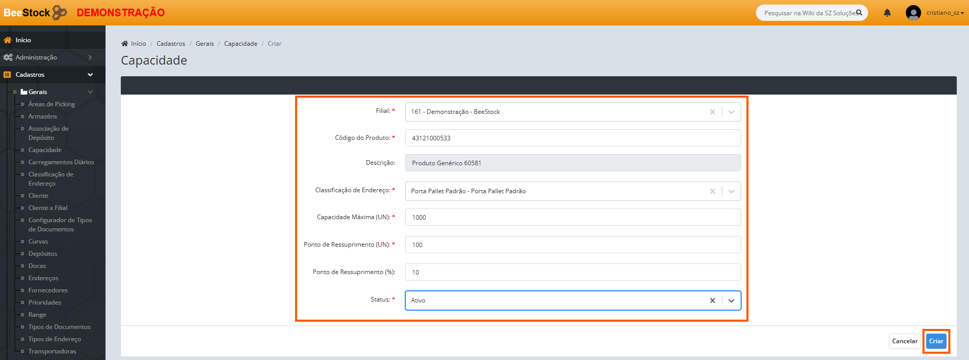 4. Preencha a Capacidade Máxima em Unidades (ex: 1000).
