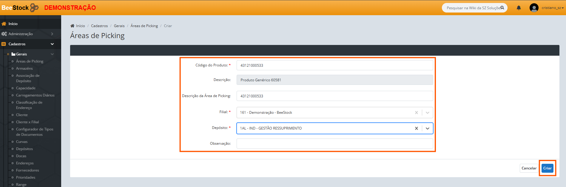 2. Crie uma nova Área de Picking, informando um código e descrição (pode ser o próprio código do produto).