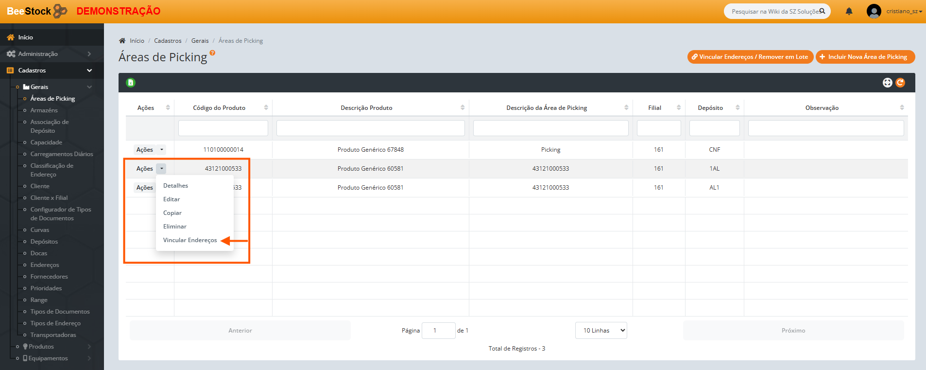 Esta tela vincula um produto a um ou mais endereços de Picking específicos, criando sua “Área de Picking”.