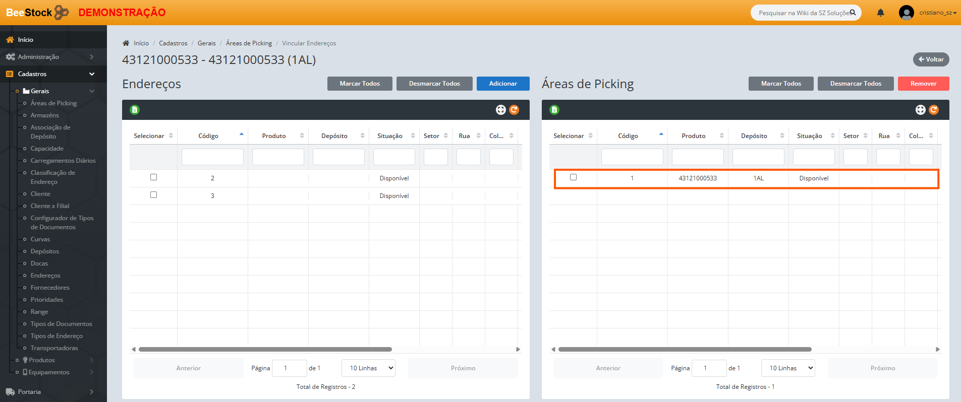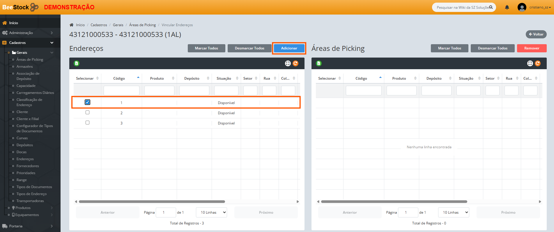 4. Na tela que se abre, selecione os endereços de Picking disponíveis à esquerda e mova-os para a direita para associá-los a esta área.