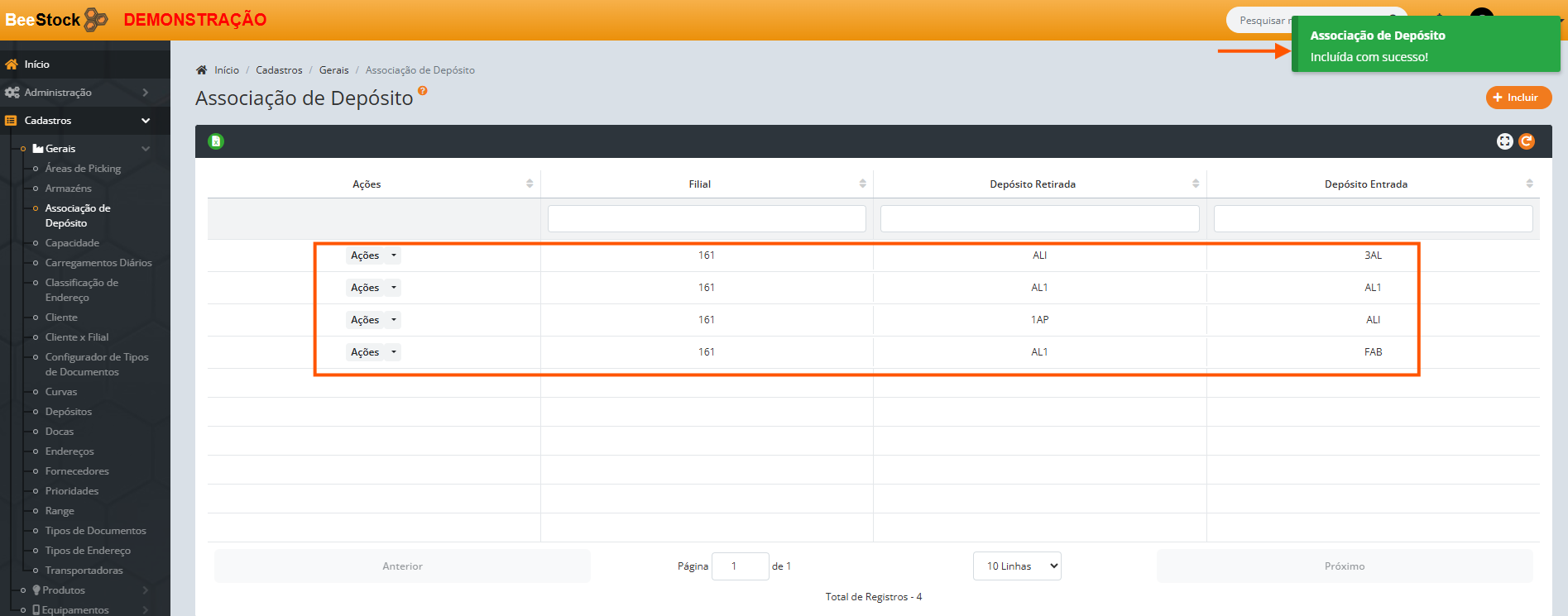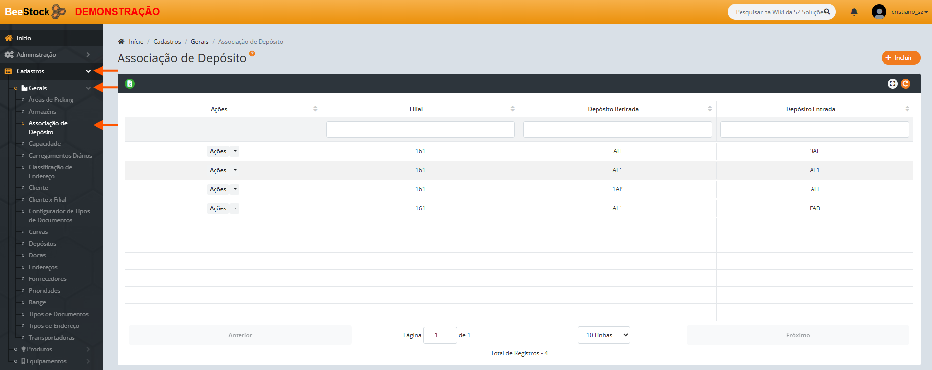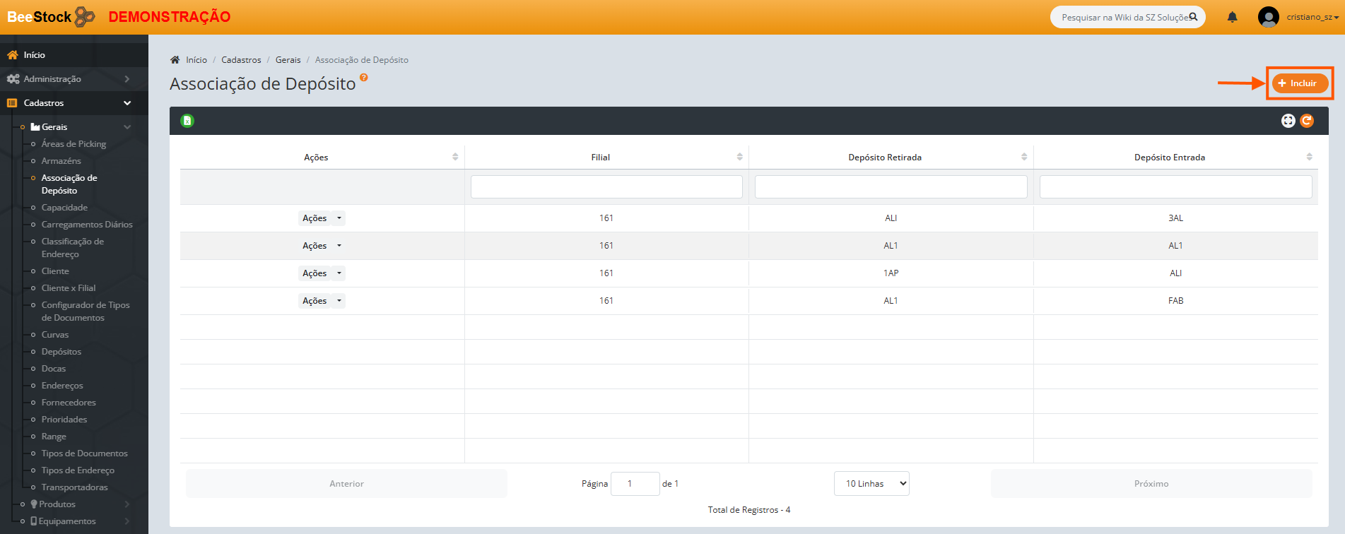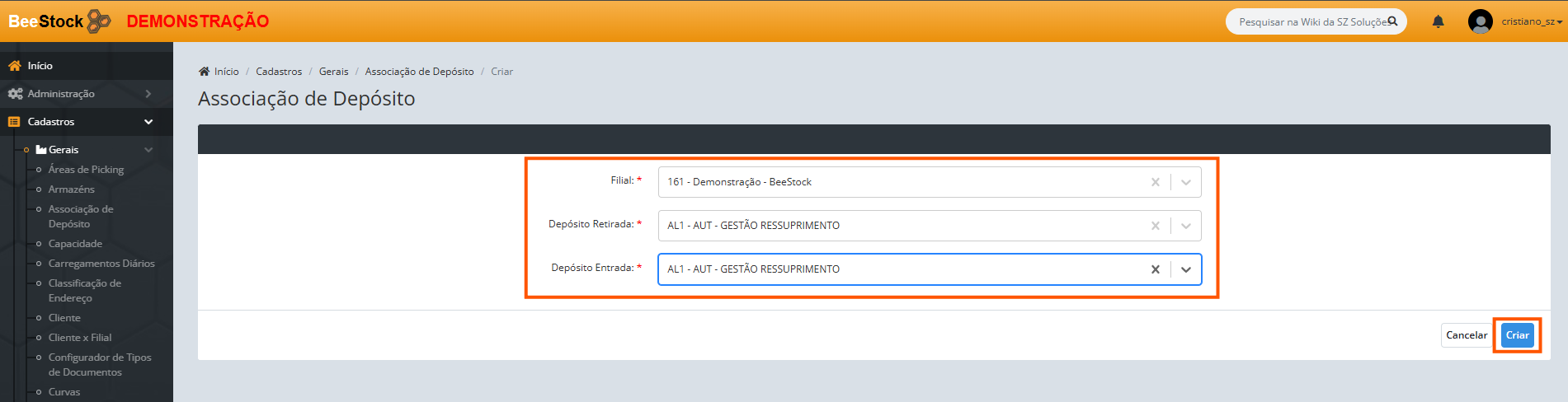 Localizado no menu Cadastros > Gerais > Associação de Depósitos.