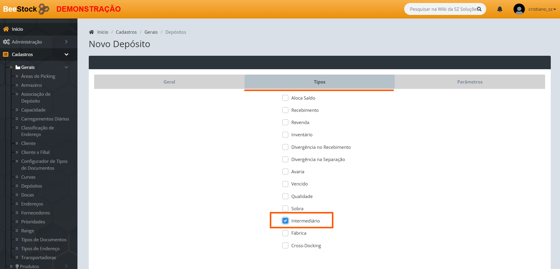 3. Preencha os campos do novo depósito e na aba Tipos marque a flag Intermediário e crie um novo depósito.