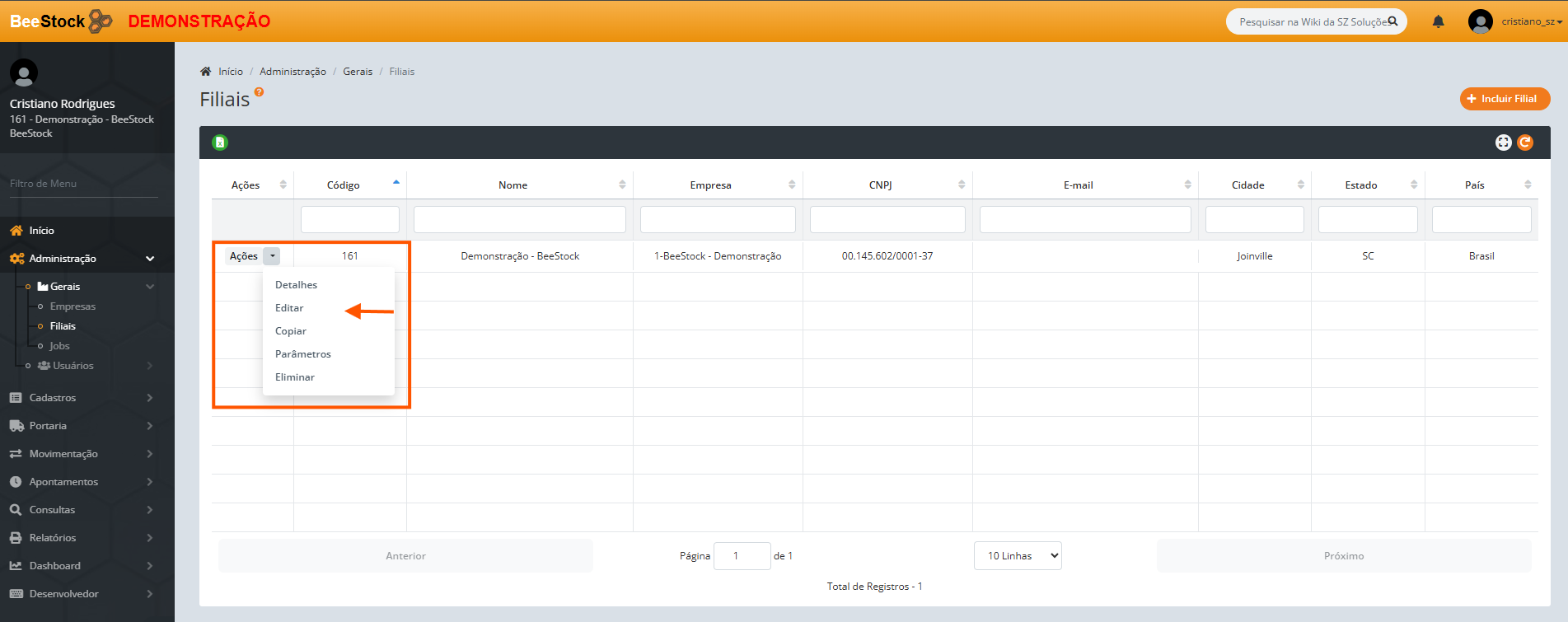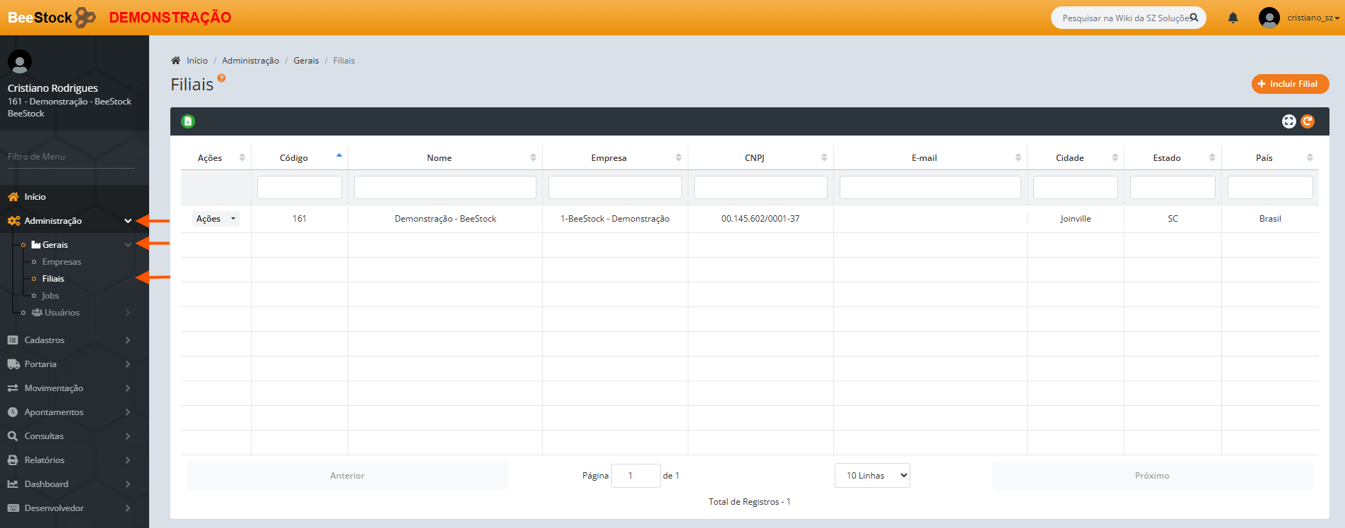 Em Administração > Gerais > Filiais