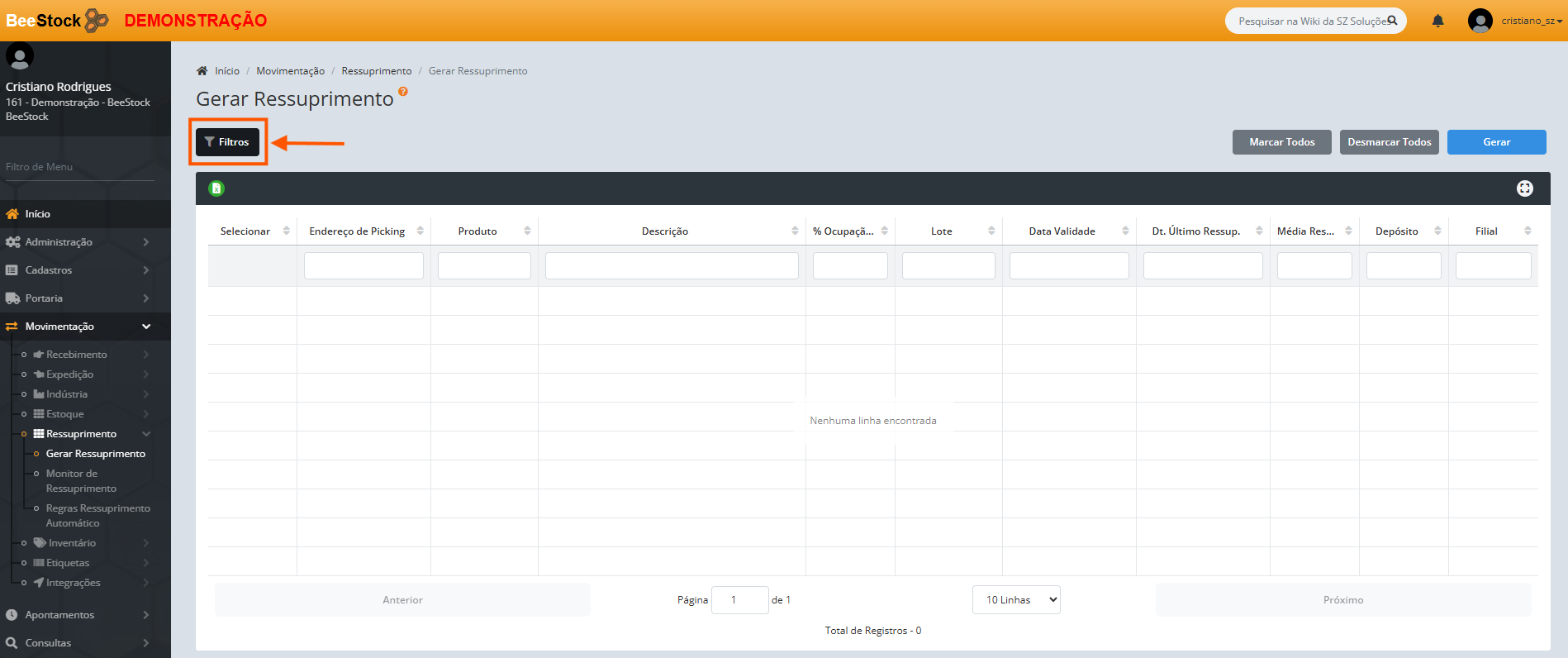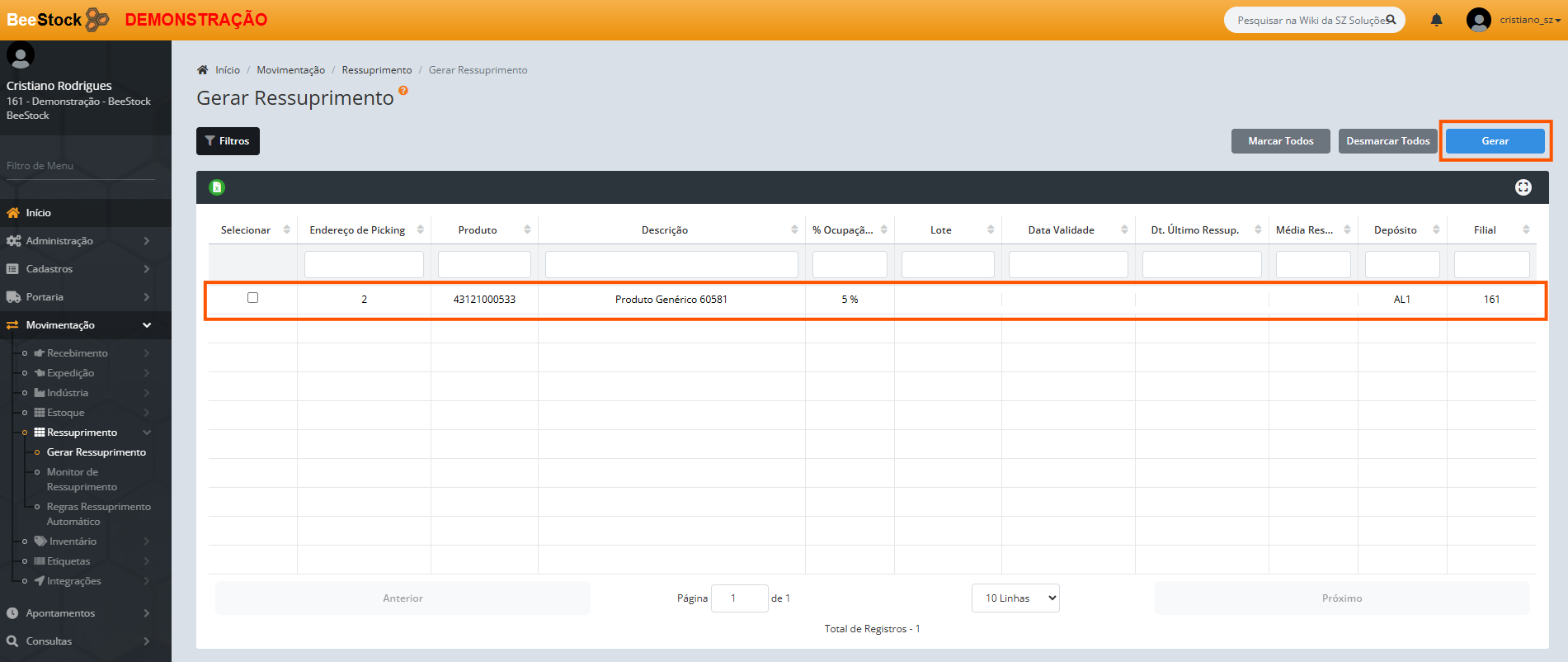 Localizado no menu Movimentação > Ressuprimento > Gerar Ressuprimento.