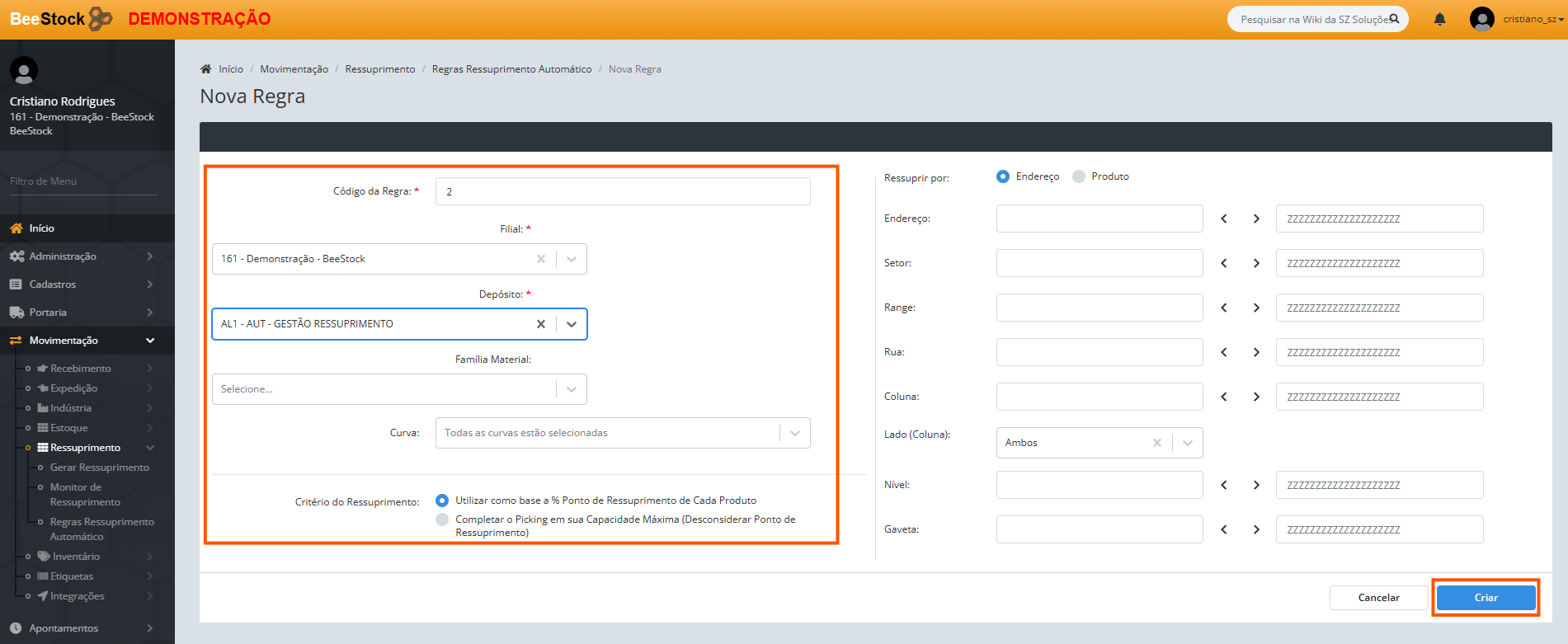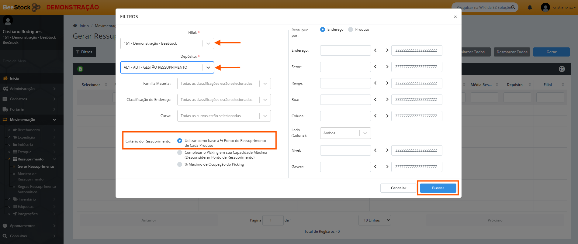 Defina os filtros (ex: Depósito) e o critério (Utilizar ponto de ressuprimento ou Completar o picking).