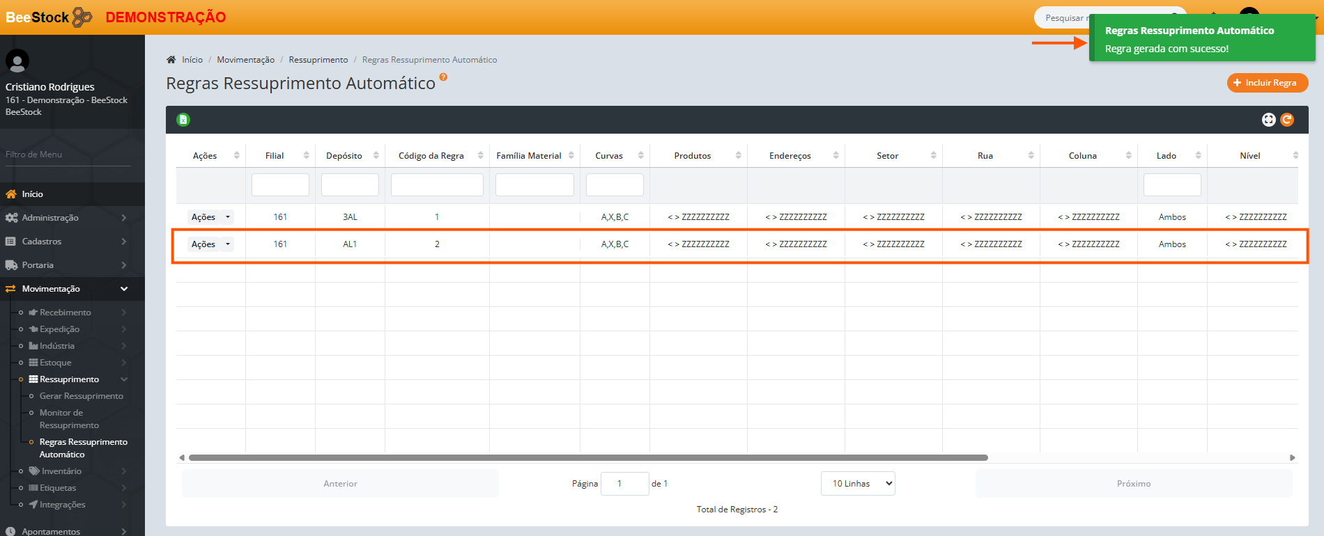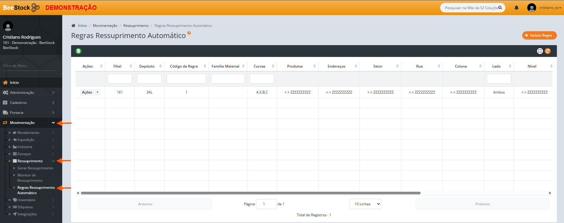 Localizado no menu Movimentação > Ressuprimento > Regras Ressuprimento Automático.