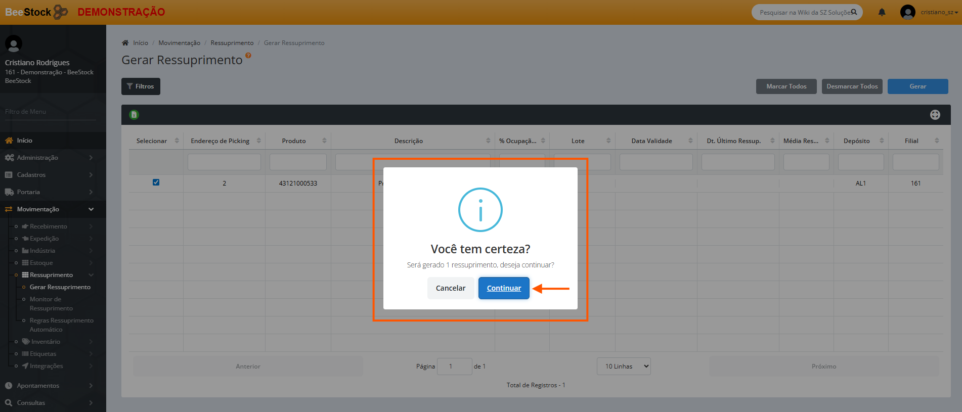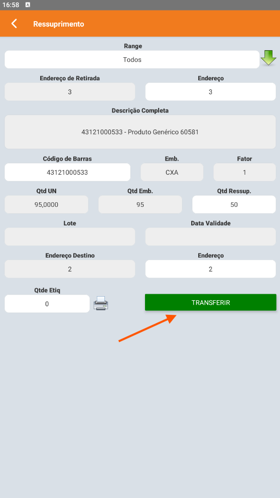 4. Confirme a Quantidade a Ressuprir. O campo é editável caso a quantidade física seja diferente.