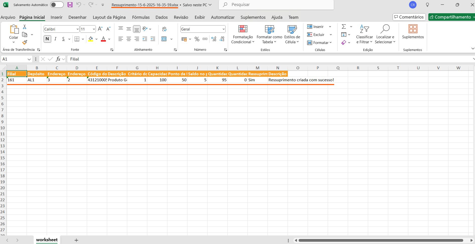 5. O sistema irá processar e, se houver saldo disponível no Pulmão, criará as tarefas de ressuprimento e gerará um relatório em Excel com os detalhes.