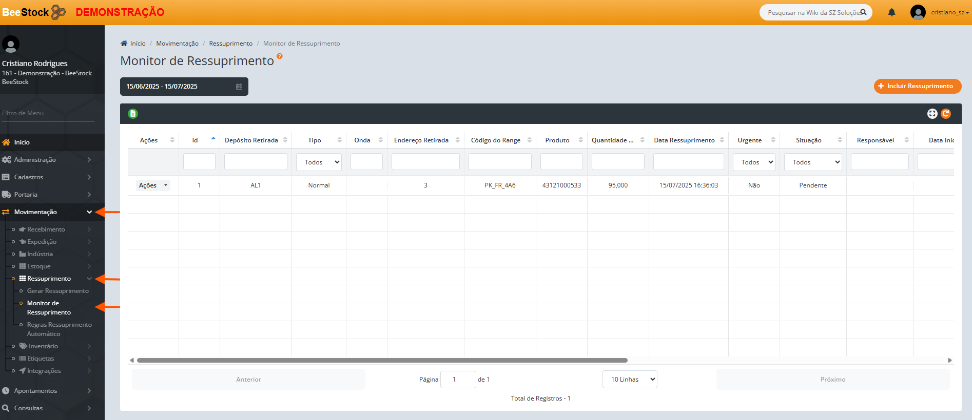 Ponto de Atenção: Ao gerar um ressuprimento, o saldo necessário é alocado no endereço de Pulmão, ficando indisponível para outras movimentações até que o abastecimento seja concluído.