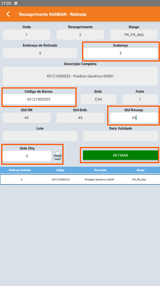 3. Siga as instruções do coletor, indo a cada Endereço de Retirada, bipando o endereço e o produto, e confirmando a quantidade.