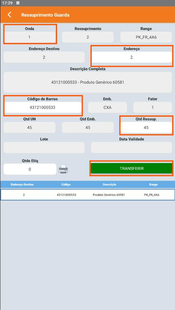 3. Vá até o endereço de Picking, leia o código de barras do endereço, do produto e confirme a quantidade a ser guardada.