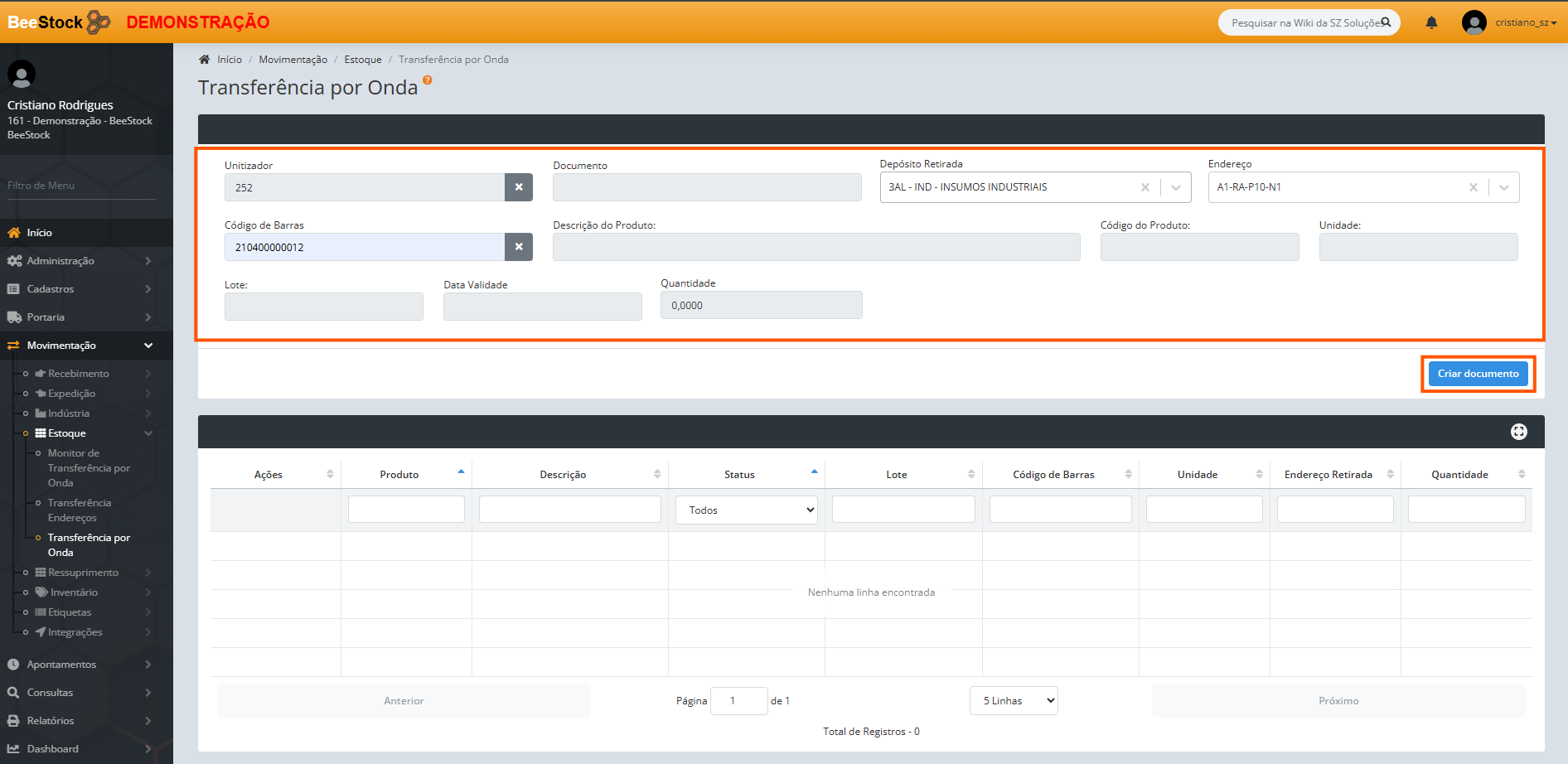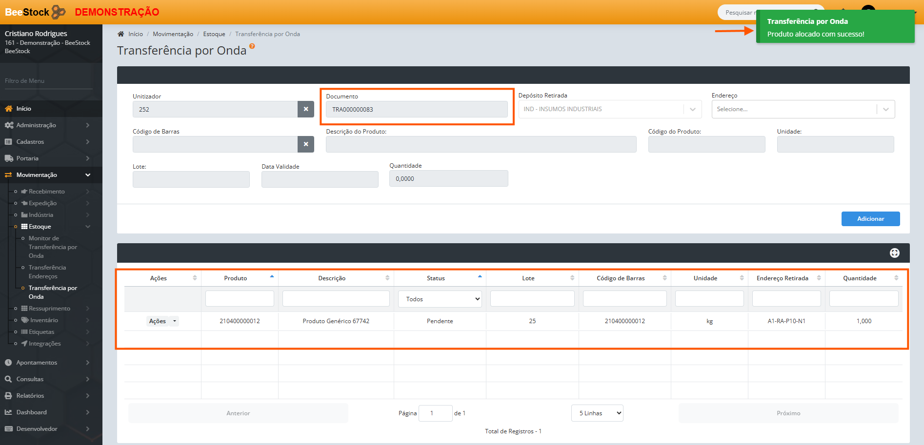 Após a inclusão dos produtos desejados no documento, ele ficará disponível para que o usuário, via coletor ou web, faça a entrada dos produtos no depósito e endereço desejado através do Monitor de Transferência por Onda.