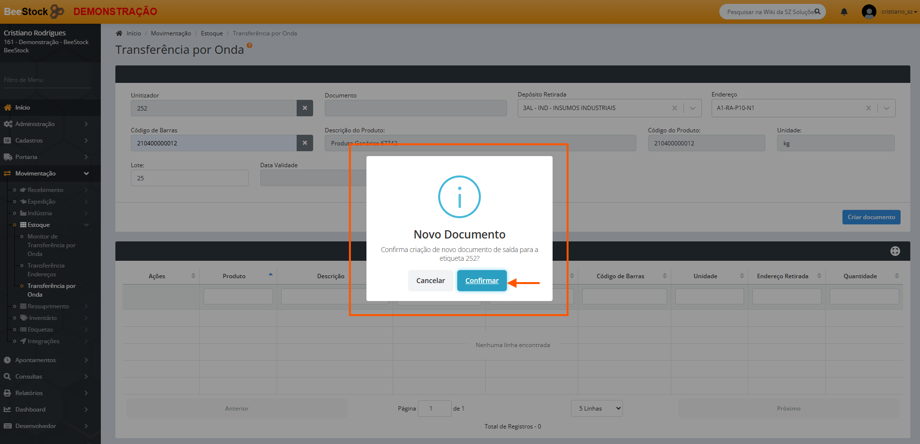 Ao finalizar os passos anteriores e clicar em Criar Documento, o sistema apresenta um alerta solicitando a confirmação do documento de transferência por onda (imagem 1), e em caso de confirmação, o documento de transferência é gerado e o produto a ser transferido é adicionado ao documento (Imagem 2).