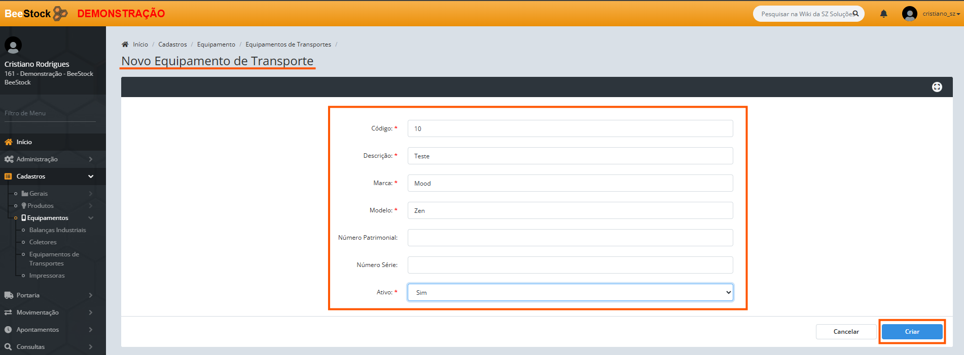 2. Na tela Novo Equipamento de Transporte, Preencha as informações e após clique em Criar :