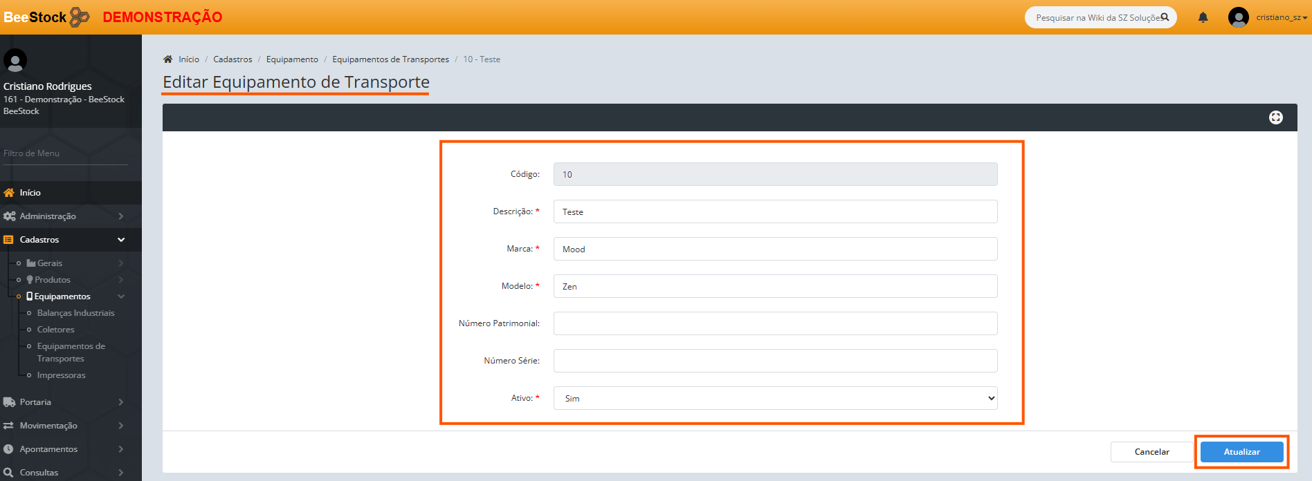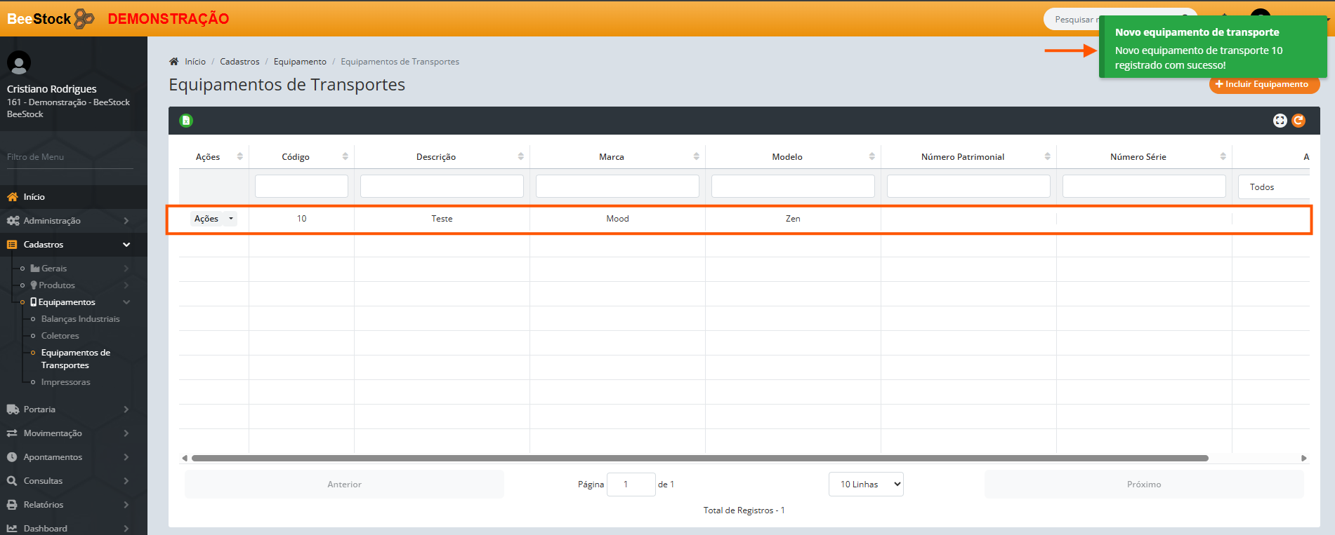 3. Ao clicar em Criar, o novo Equipamento de Transporte será criado: