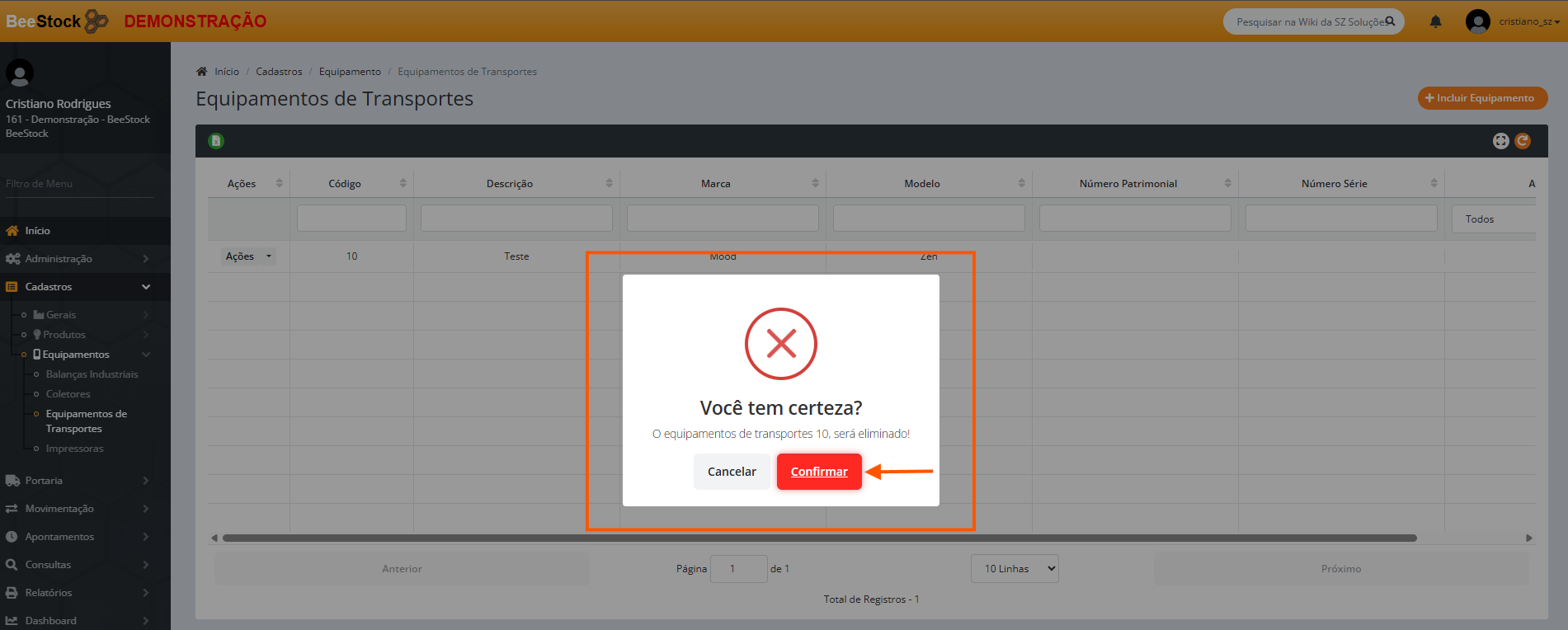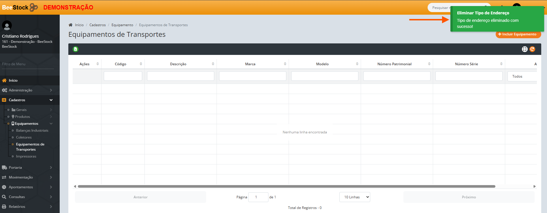 4. No botão Ações > Eliminar poderá excluir o Equipamento de Transporte.