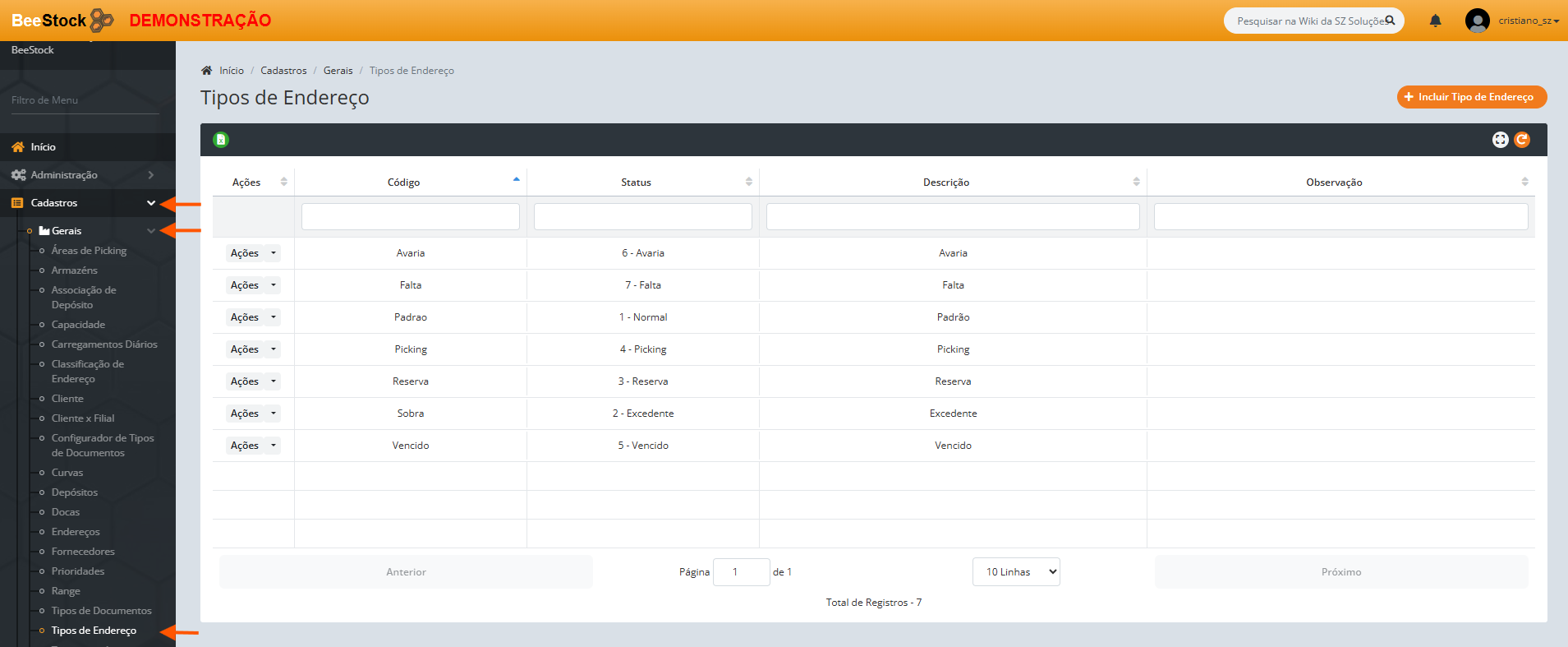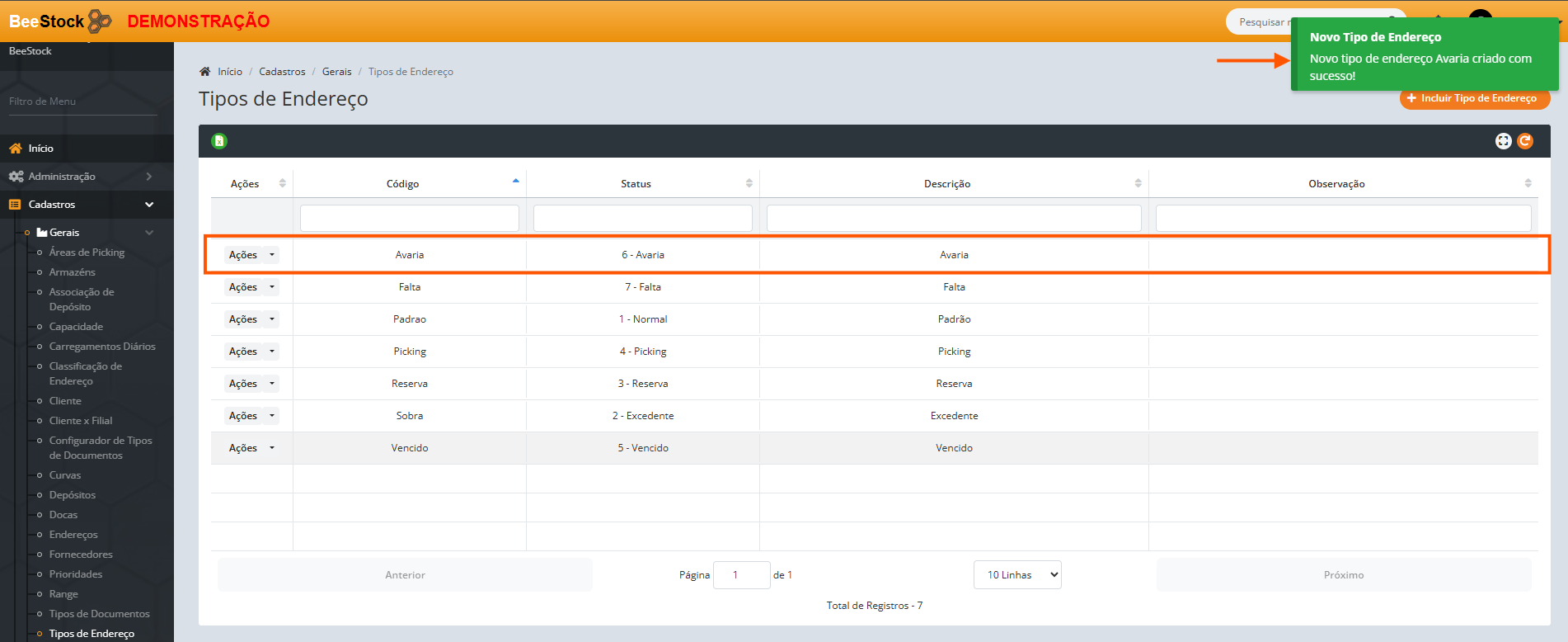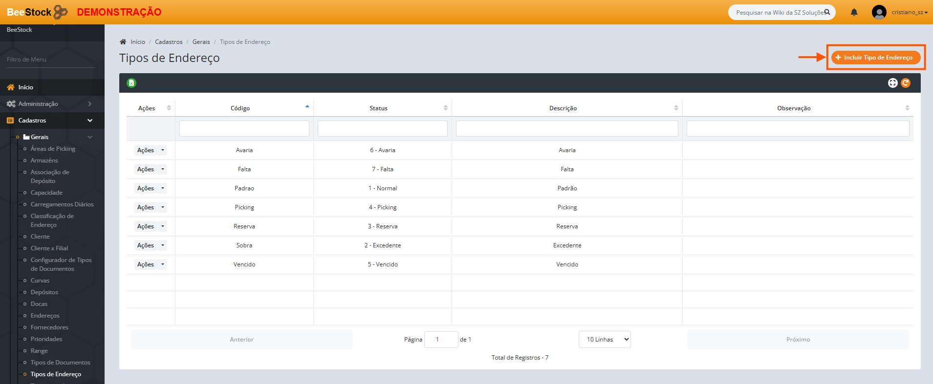 1. Clique no botão laranja + Incluir Tipo de Endereço.