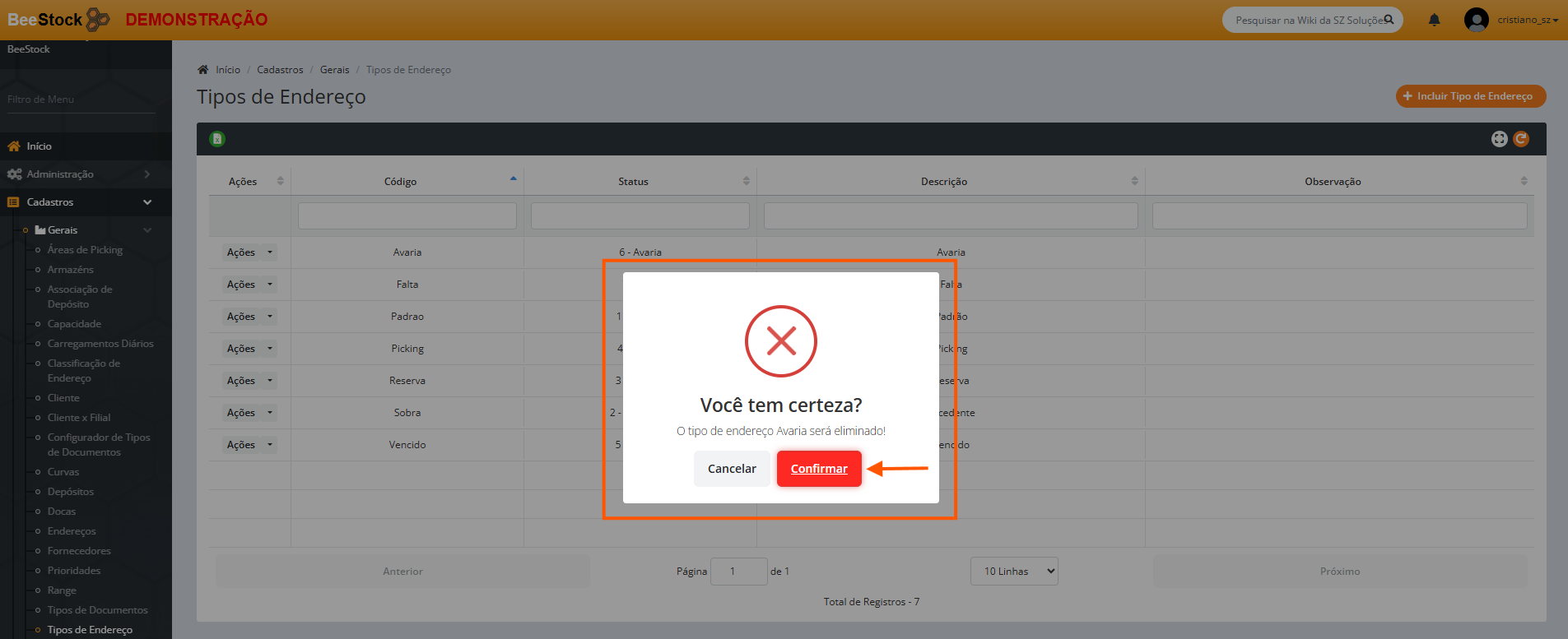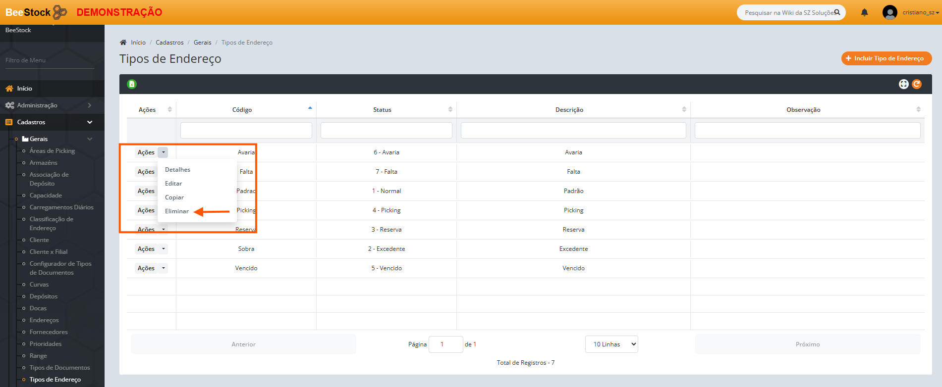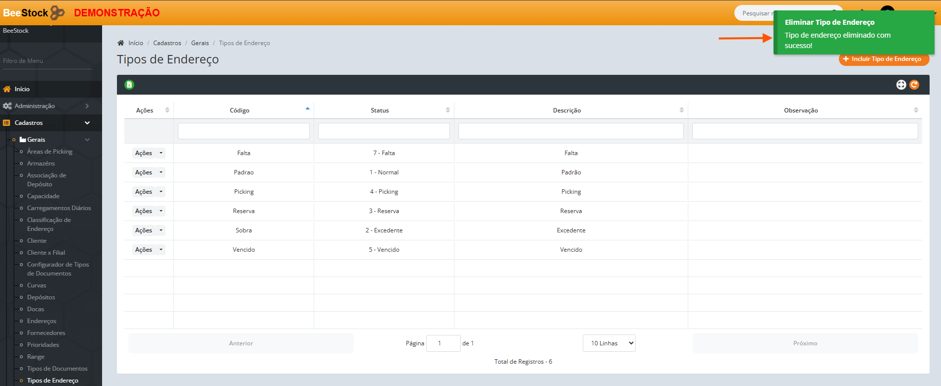 4. No botão Ações > Eliminar poderá excluir o tipo de endereço.