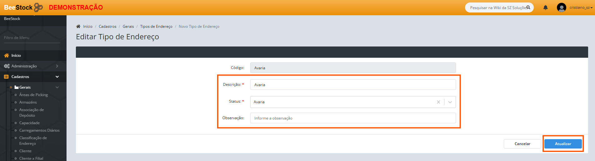 2. Na tela Novo Tipo de Endereço, Preencha as informações dos campos e após clique em Criar :