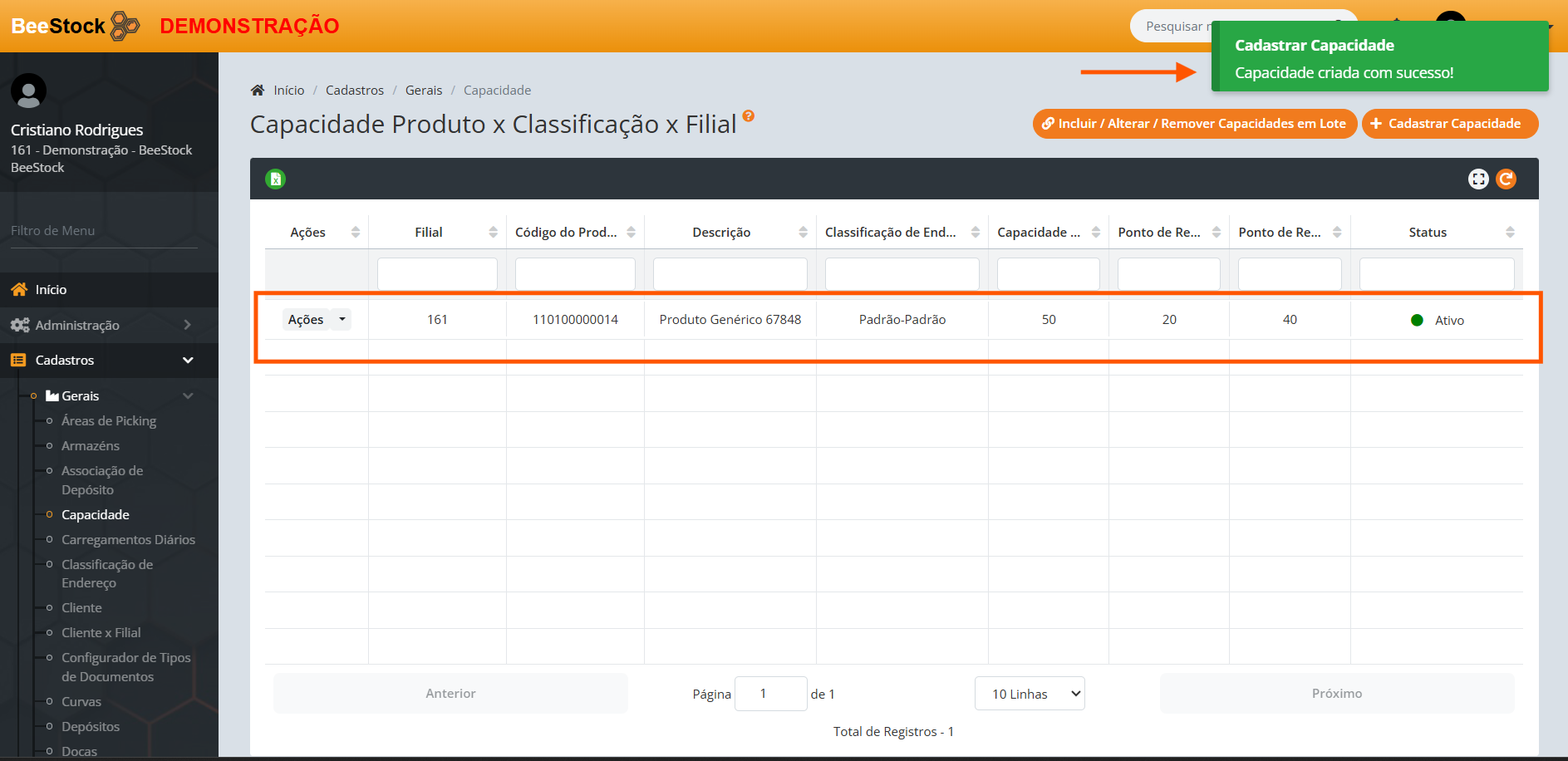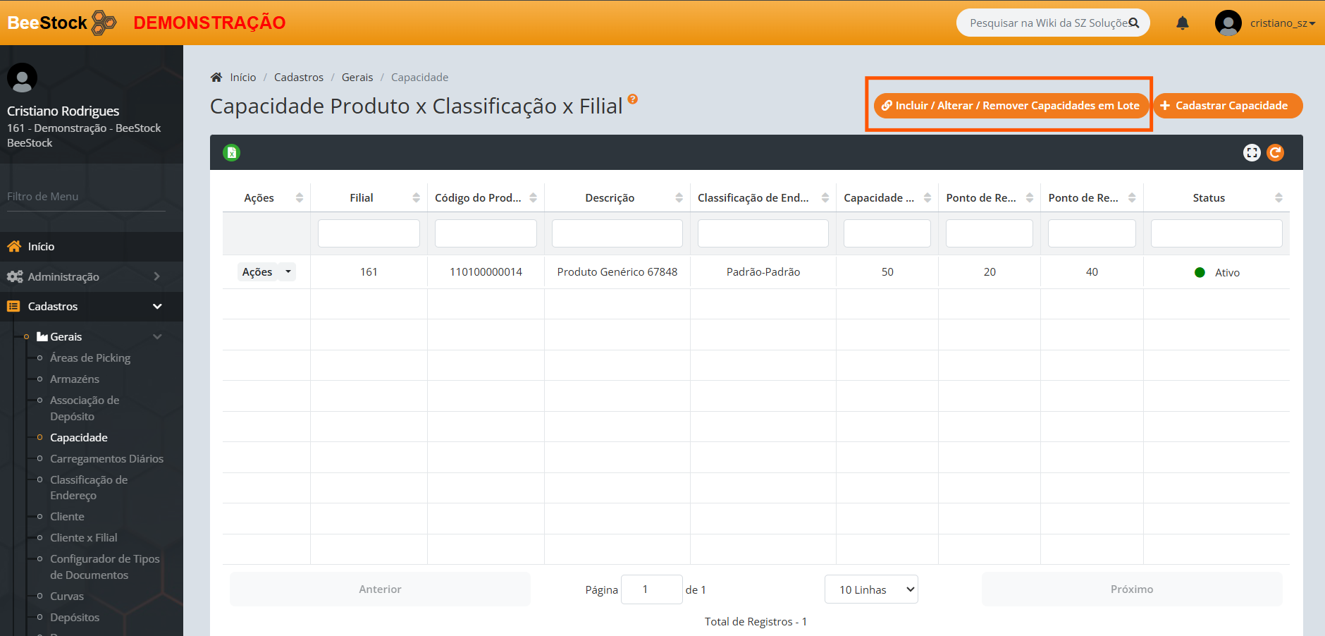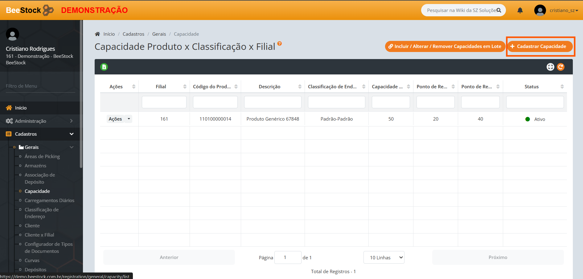 1. Se deseja incluir a Capacidade de apenas um produto: Clique no botão laranja + Cadastrar Capacidade.