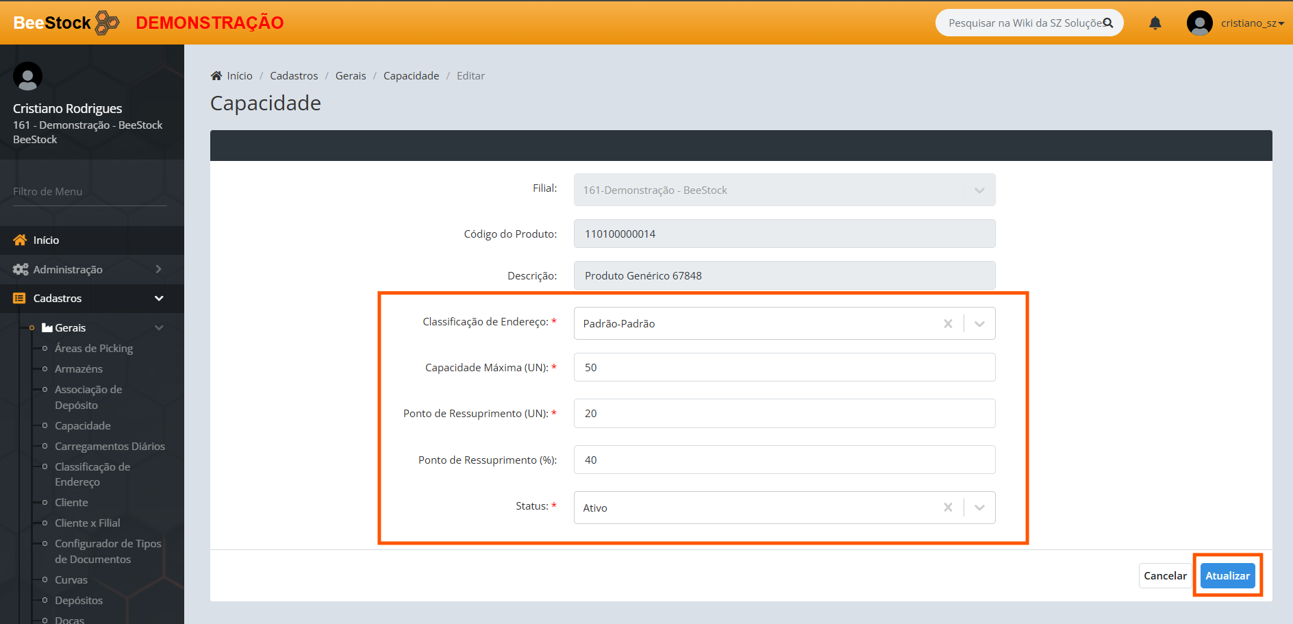 5. No botão Ações > Editar o usuário pode alterar apenas Classificação de Endereço, Capacidade Máxima (UN), Ponto de Ressuprimento (UN) e o Status , após clicar em Atualizar .