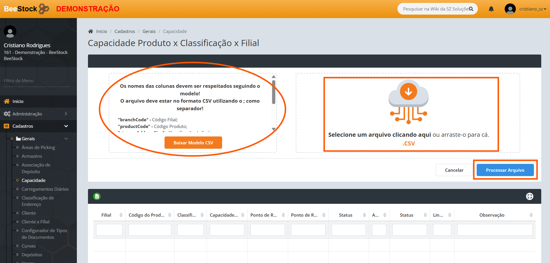 7. Na tela você poderá Baixar Modelo CSV e seguir exemplo, e ao lado direito você poderá Selecionar um Arquivo ou Arrasta-lo , após Clicar no botão Processar Arquivo :