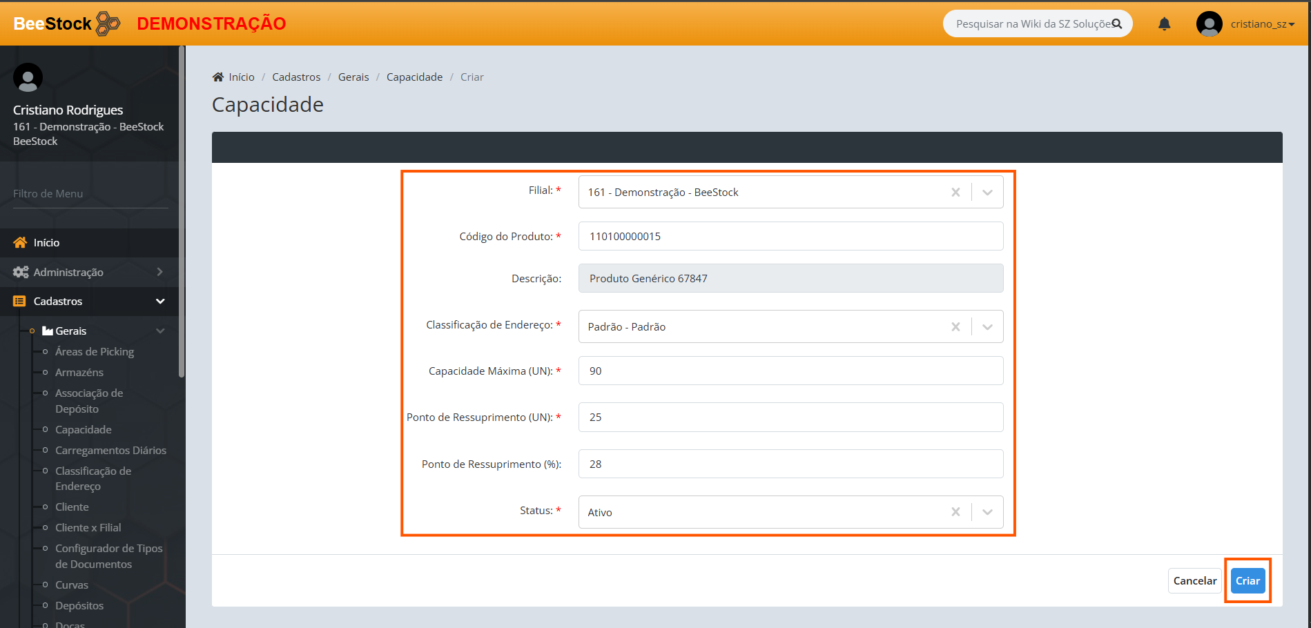 2. Na tela Capacidade, Preencha as informações e após clique em Criar :