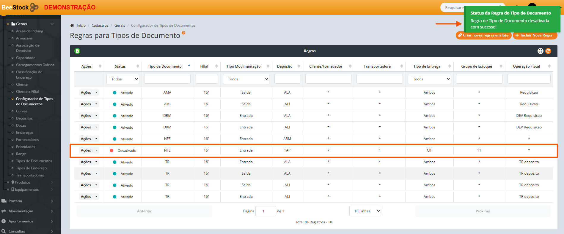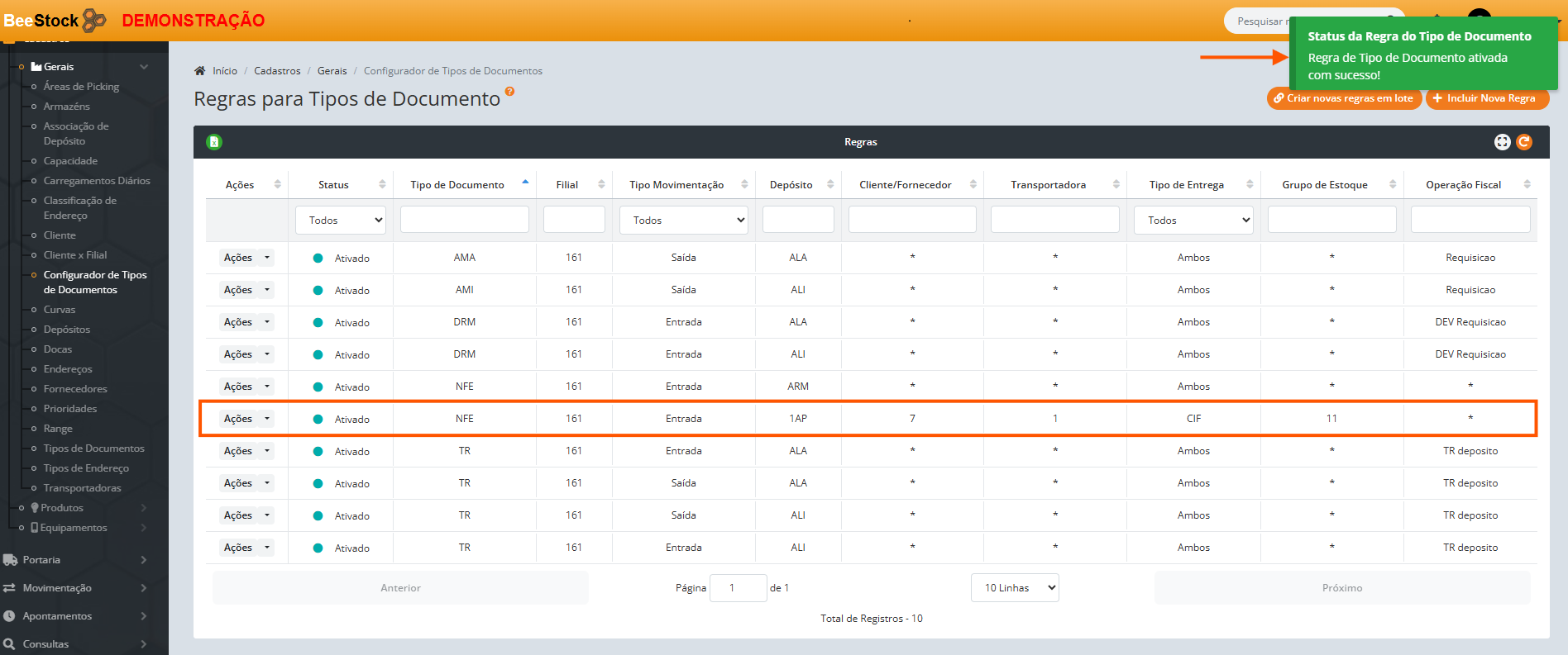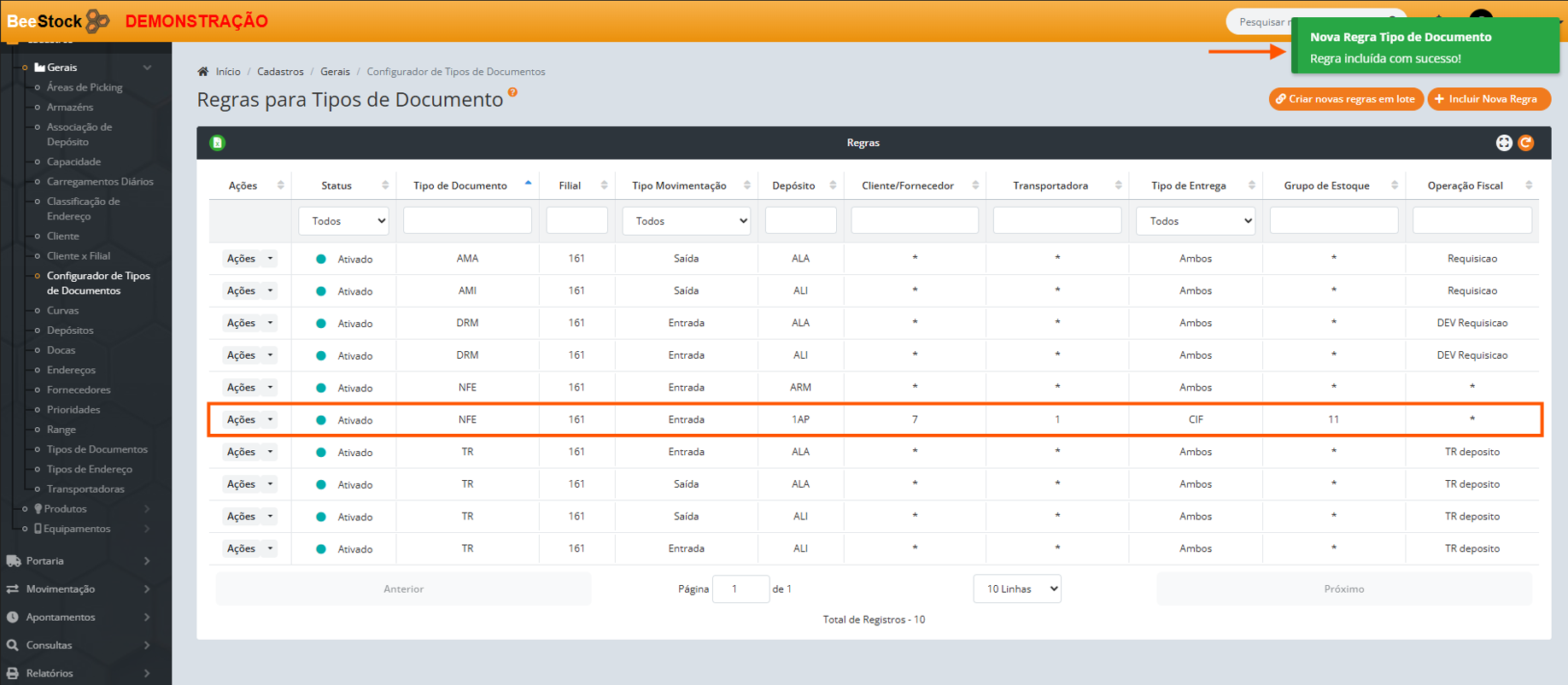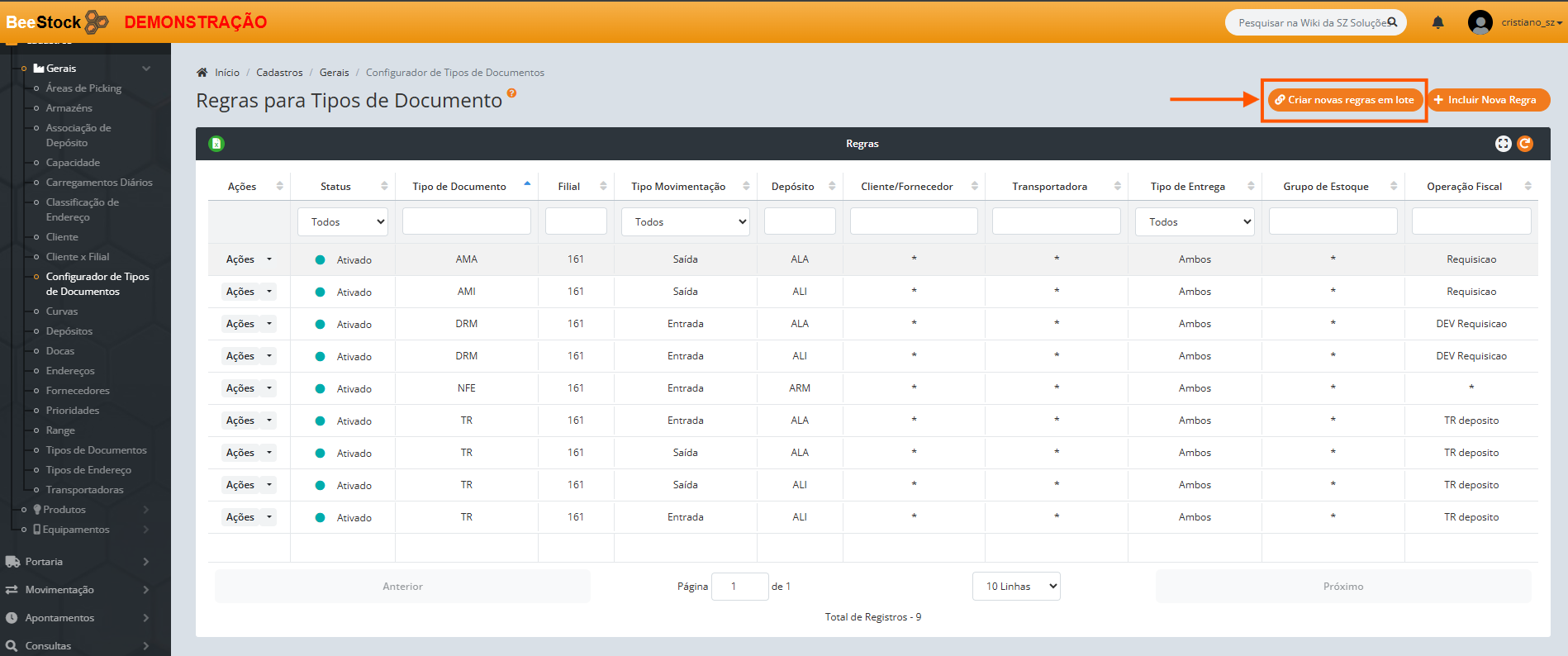 7. Se deseja incluir Nova Regra para múltiplos tipos de documentos: Clique no botão laranja Criar Novas Regras em Lote.