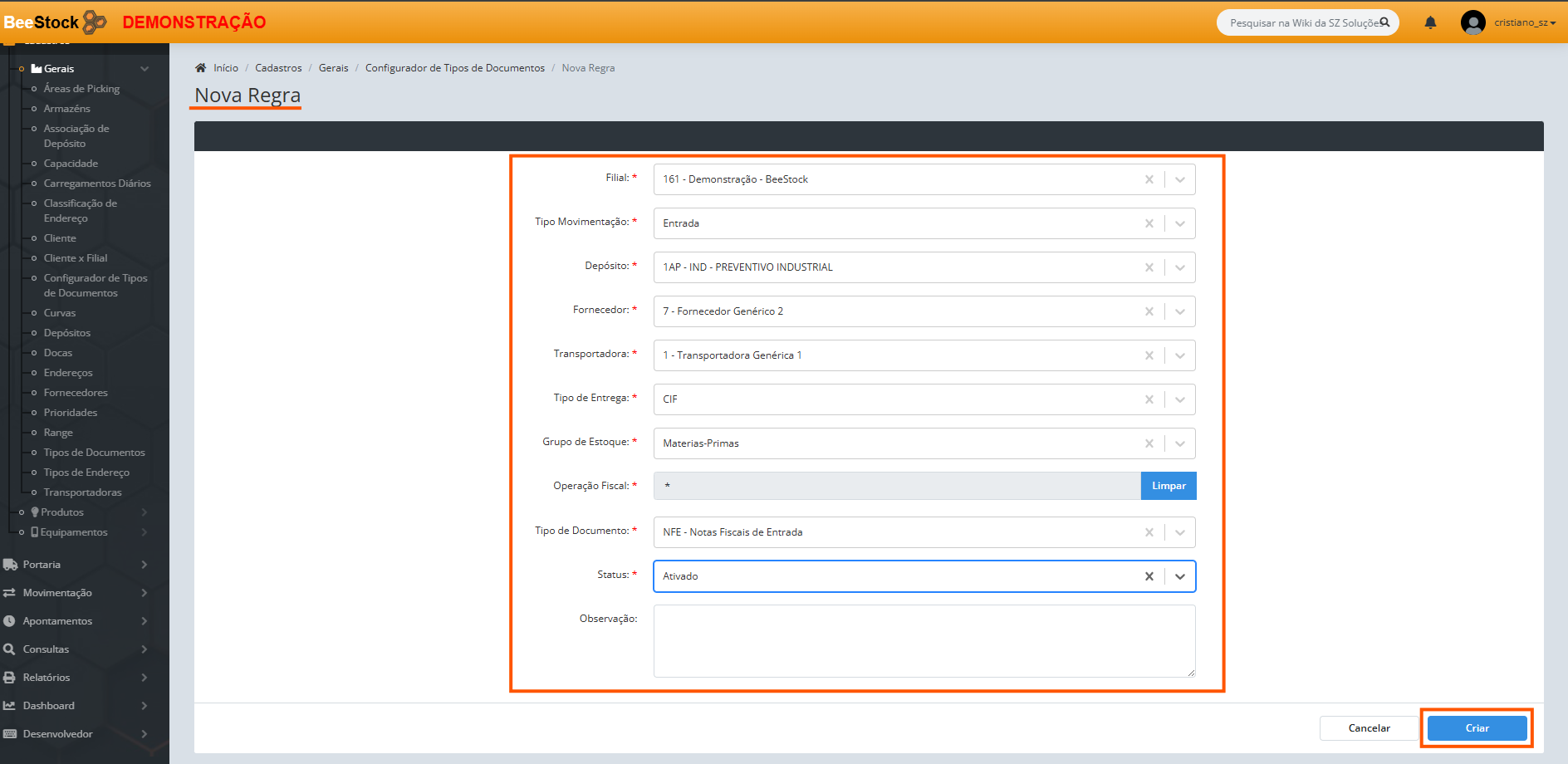 2. Na tela Nova Regra, Preencha as informações e após clique em Criar :