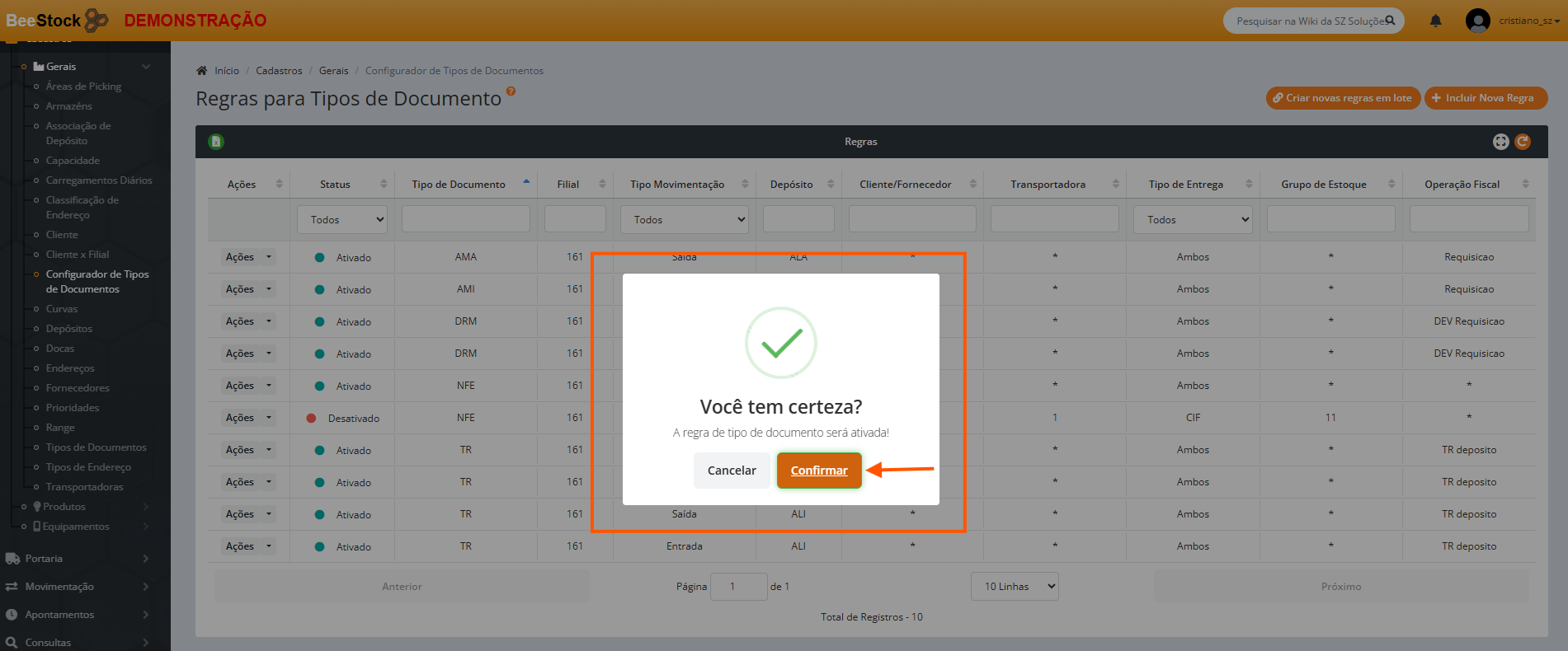 6. No botão Ações > Ativar o usuário pode Reativar a nova regra, após clicar em Confirmar .