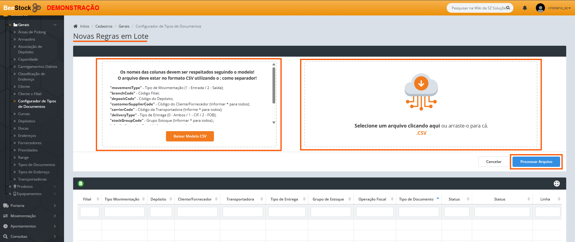 8. Na tela você poderá Baixar Modelo CSV e seguir exemplo, e ao lado direito você poderá Selecionar um Arquivo ou Arrasta-lo , após Clicar no botão Processar Arquivo :
