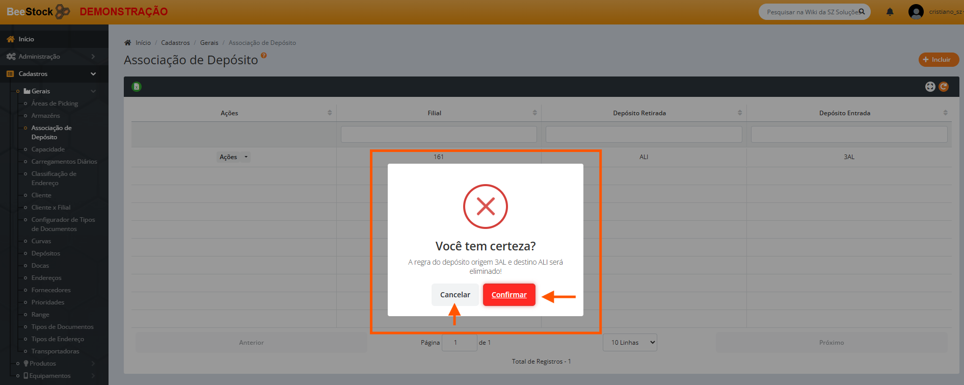 4. No botão Ações > Eliminar poderá excluir a associação de depósito.
