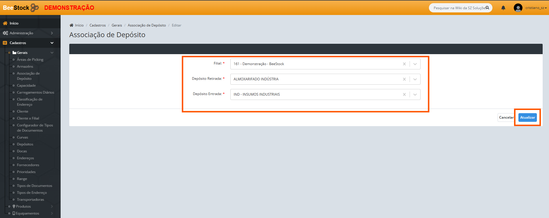 5. No botão Ações > Editar o usuário pode alterar apenas Filial, Depósito Retirada e o Depósito Entrada , após clicar em Atualizar .