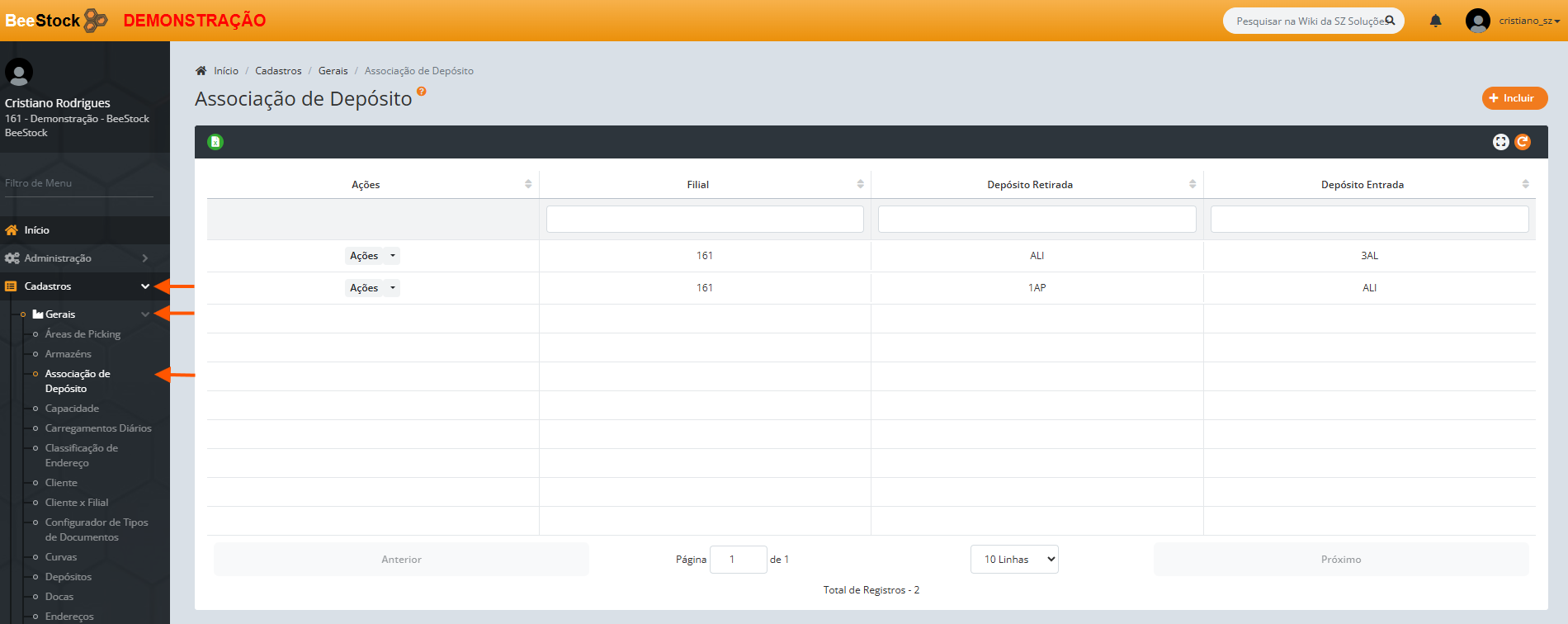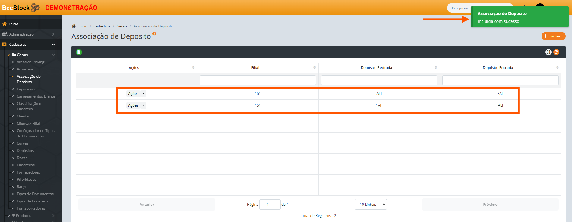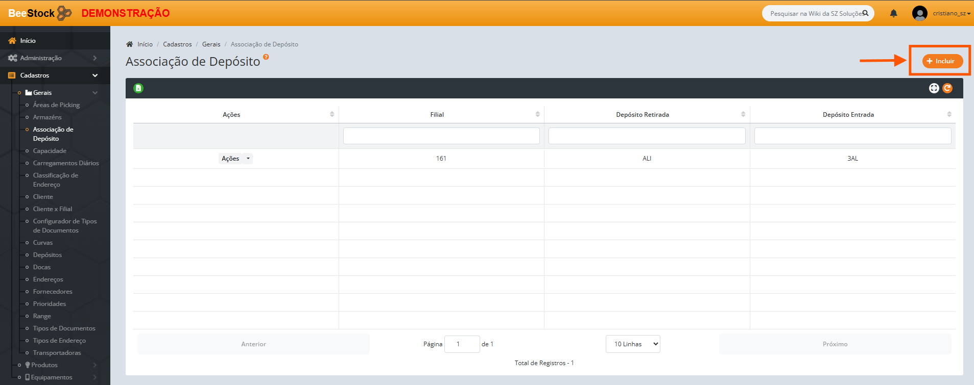 1. Para associar um depósito: Clique no botão laranja + Incluir.