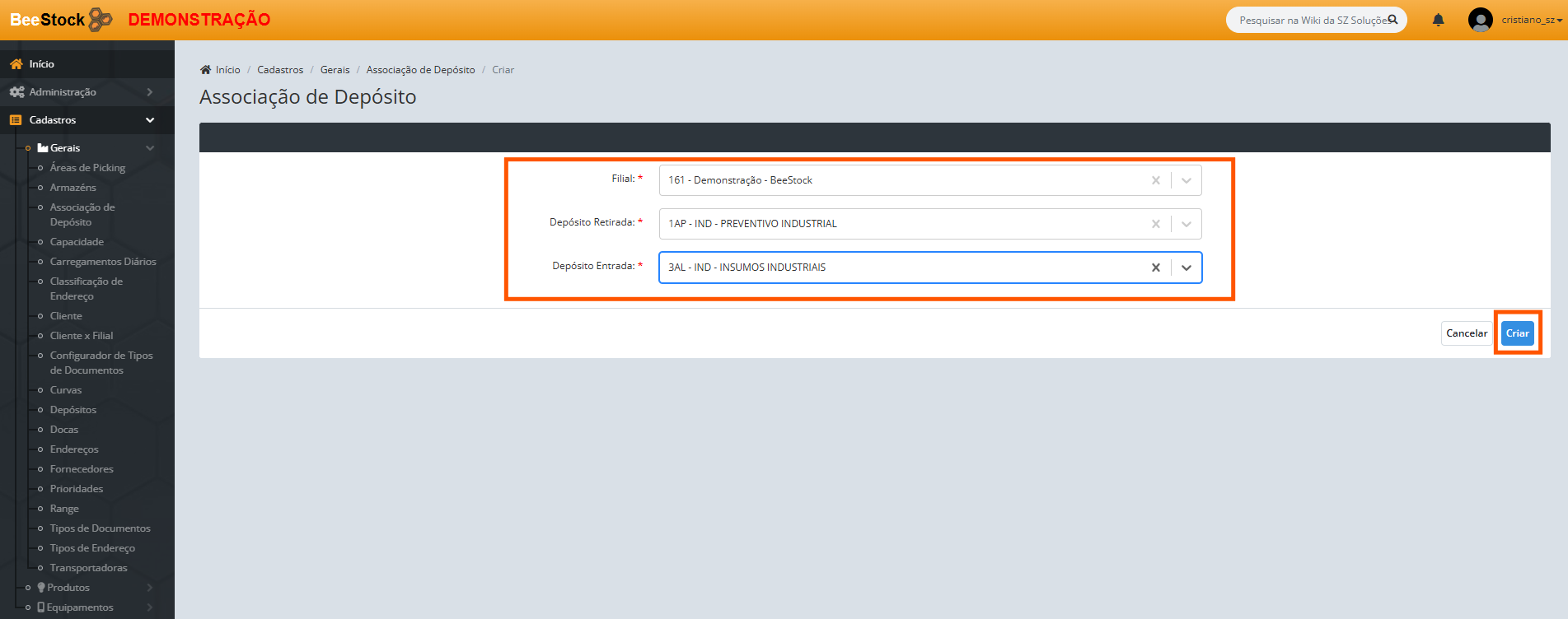 2. Na tela Associação de Depósito, Preencha as informações e após clique em Criar :