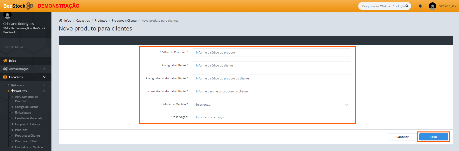Ao incluir um novo produto por cliente, o usuário deverá preencher os seguintes campos, conforme imagem e descrição abaixo e clicar no botão Criar: