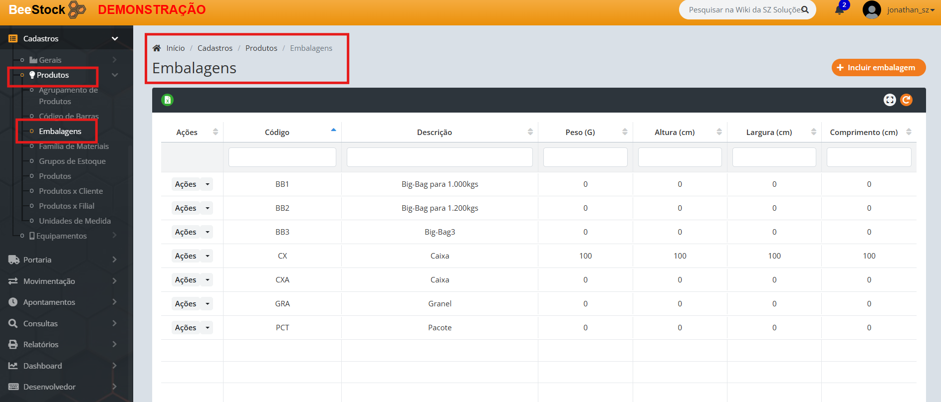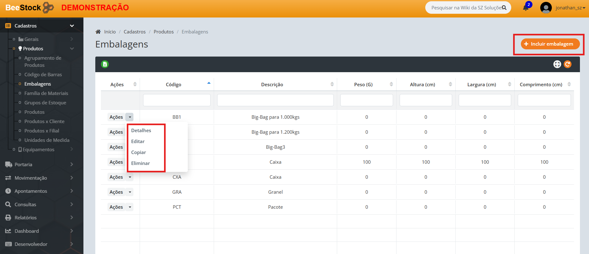 A partir da tela de cadastro de Embalagens, o usuário tem a opção de: